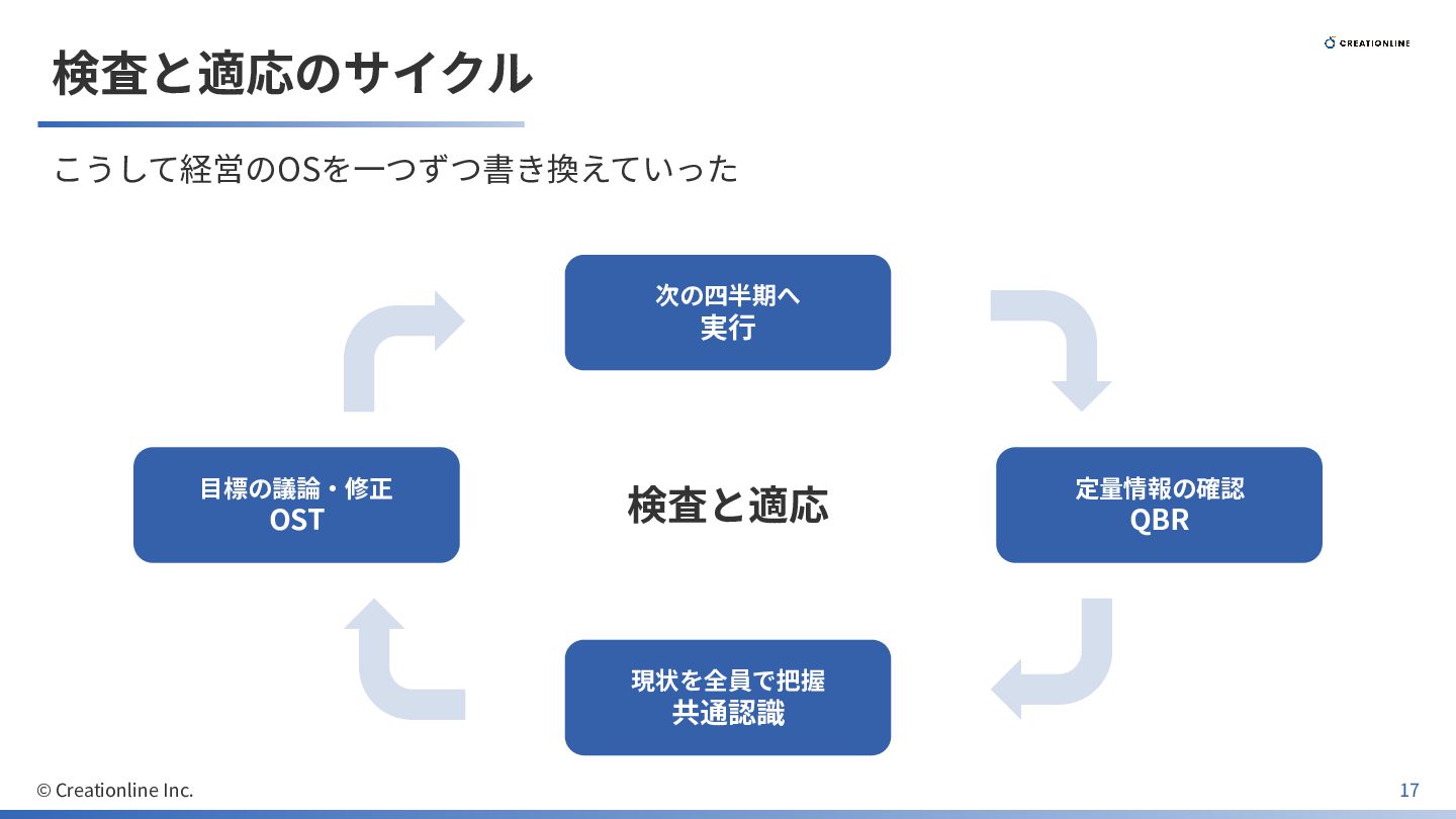 検査と適応のサイクル こうして経営のOSを⼀つずつ書き換えていった 検査と適応 定量情報の確認 QBR 現状を全員で把握 共通認識 ⽬標の議論‧修正 OST 次の四半期へ