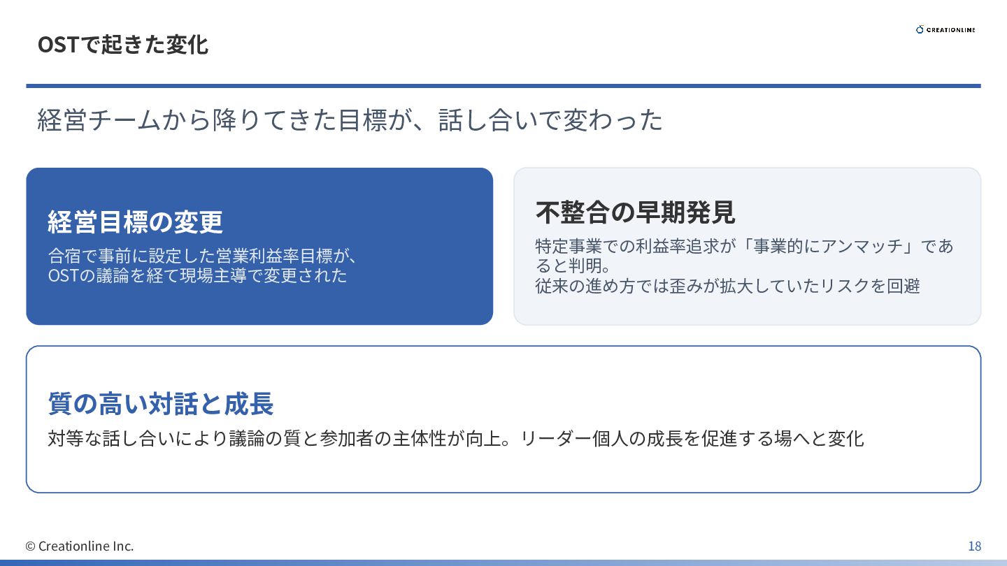 OSTで起きた変化 経営チームから降りてきた⽬標が、話し合いで変わった 経営⽬標の変更 合宿で事前に設定した営業利益率⽬標が、 OSTの議論を経て現場主導で変更された 不整合の早期発⾒ 特定事業での利益率追求が「事業的にアンマッチ」であ ると判明。 従来の進め⽅では歪みが拡⼤していたリスクを回避 質の⾼い対話と成⻑