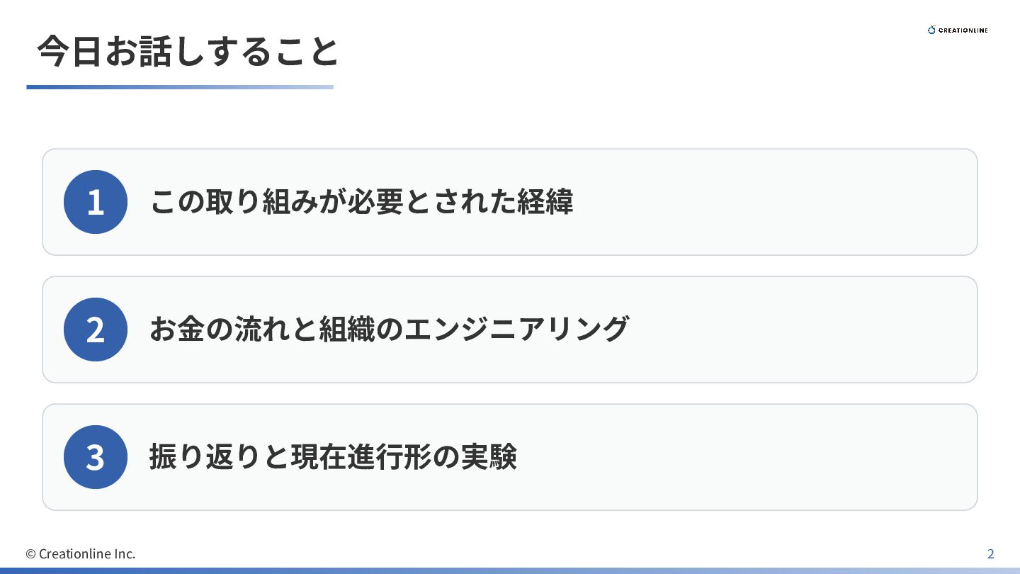 今⽇お話しすること 1 この取り組みが必要とされた経緯 2 お⾦の流れと組織のエンジニアリング 3 振り返りと現在進⾏形の実験 © Creationline Inc.