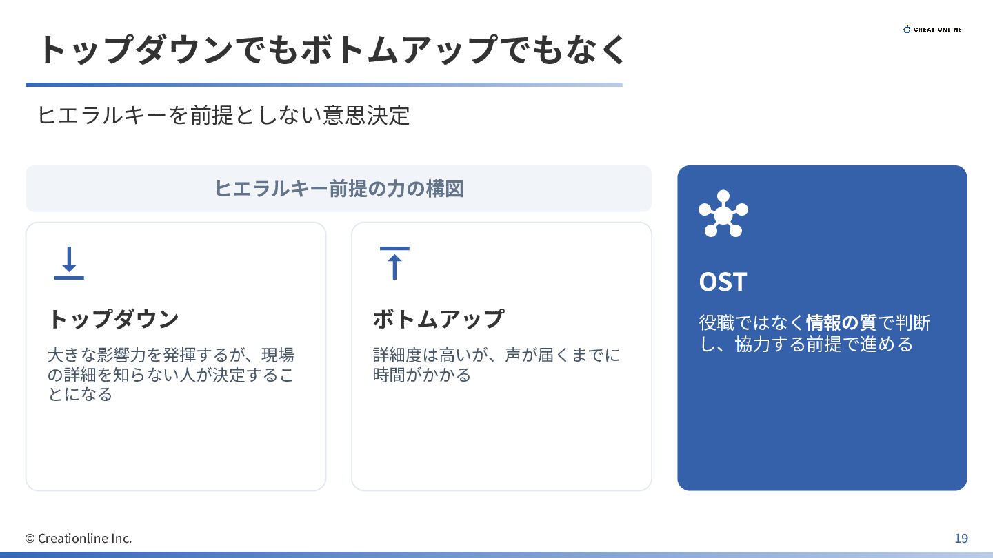の詳細を知らない⼈が決定するこ とになる ボトムアップ 詳細度は⾼いが、声が届くまでに 時間がかかる OST 役職ではなく情報の質で判断 し、協⼒する前提で進める