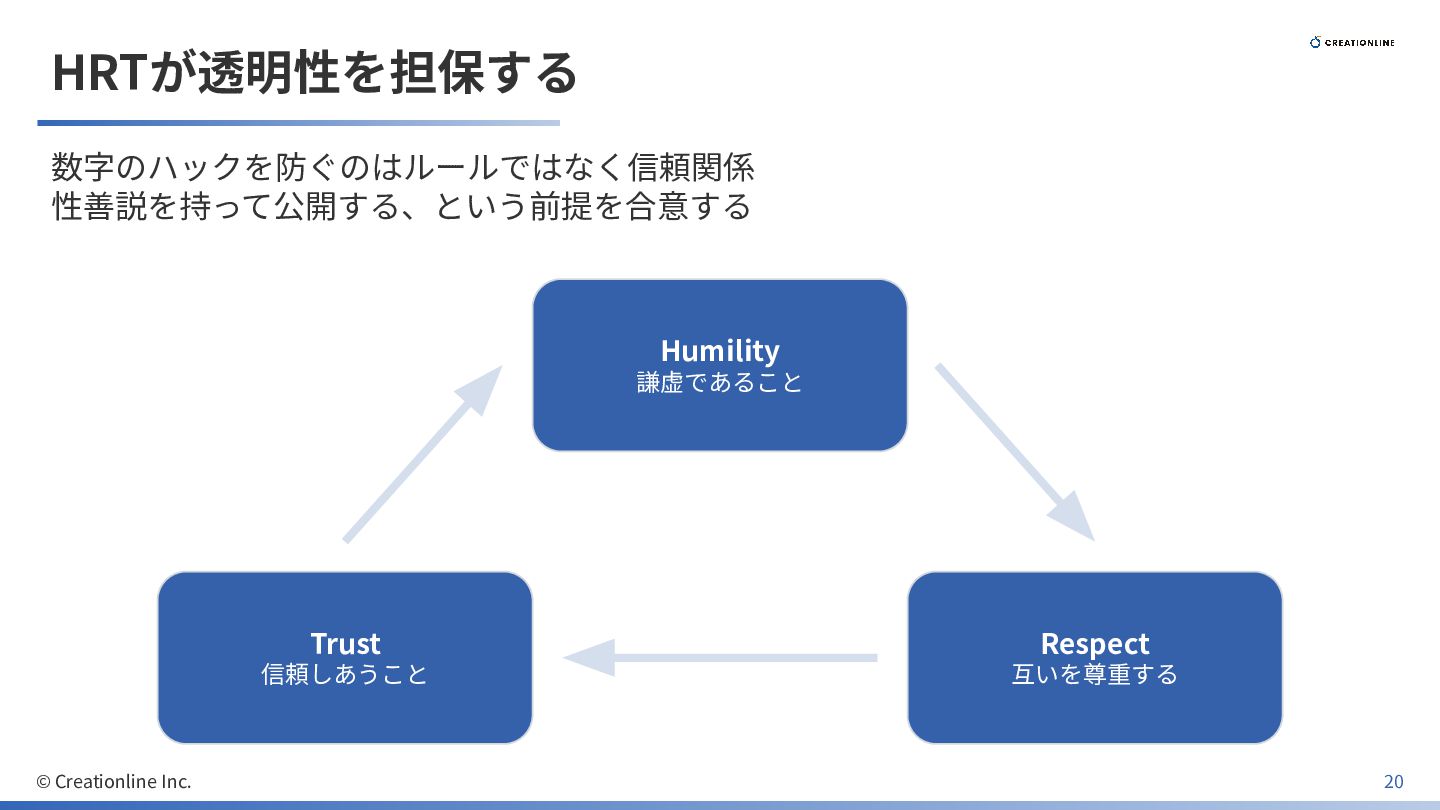 HRTが透明性を担保する 数字のハックを防ぐのはルールではなく信頼関係 性善説を持って公開する、という前提を合意する Humility 謙虚であること Respect 互いを尊重する Trust 信頼しあうこと ©