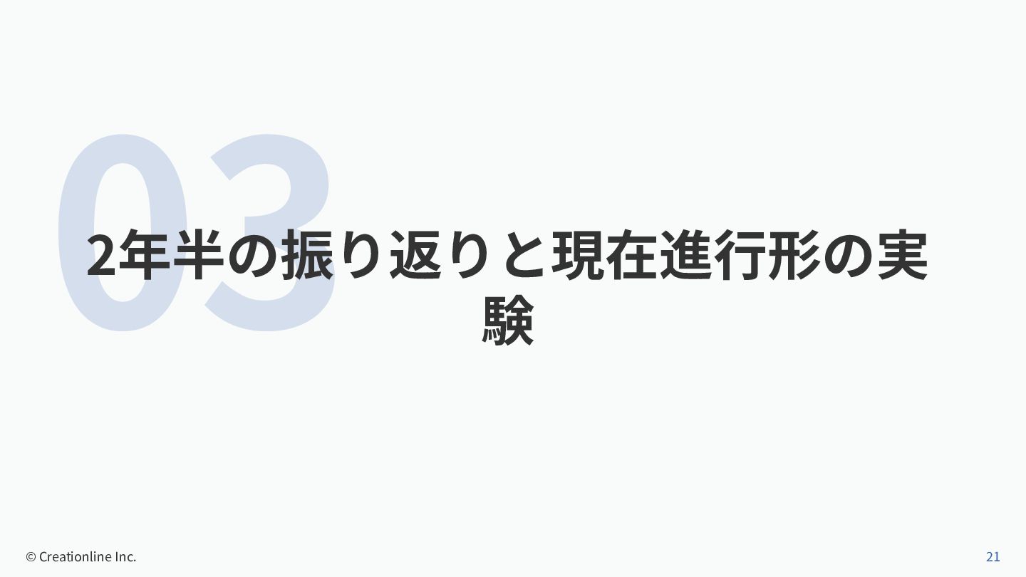 03 2年半の振り返りと現在進⾏形の実 験 © Creationline Inc. 21