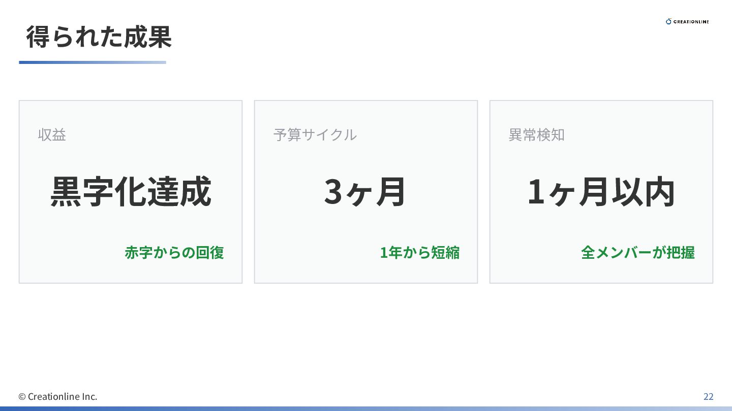 得られた成果 収益 黒字化達成 ⾚字からの回復 予算サイクル 3ヶ⽉ 1年から短縮 異常検知 1ヶ⽉以内 全メンバーが把握