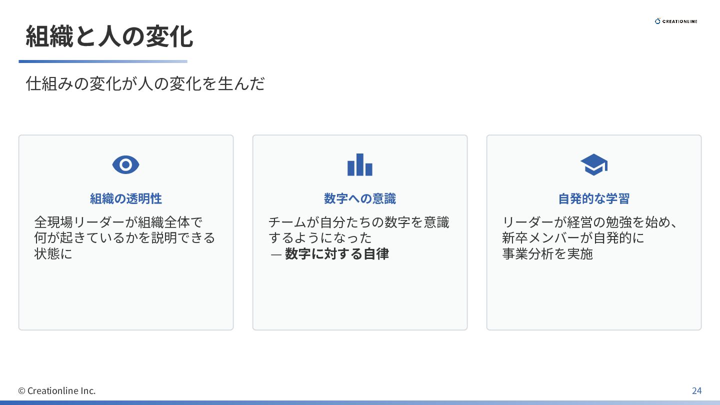 組織と⼈の変化 仕組みの変化が⼈の変化を⽣んだ © Creationline Inc. 24 組織の透明性 全現場リーダーが組織全体で 何が起きているかを説明できる