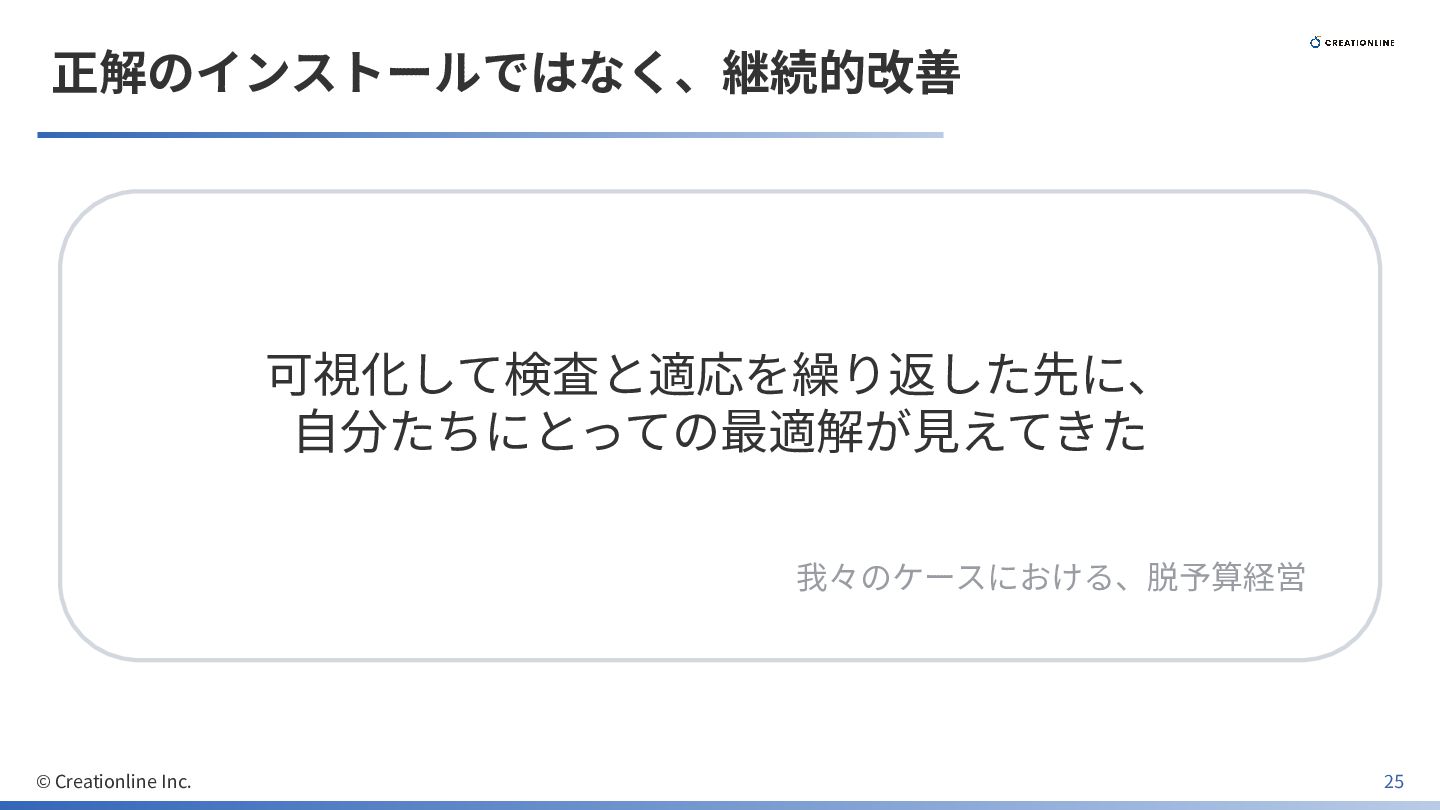 正解のインストールではなく、継続的改善 可視化して検査と適応を繰り返した先に、 ⾃分たちにとっての最適解が⾒えてきた 我々のケースにおける、脱予算経営 © Creationline Inc. 25