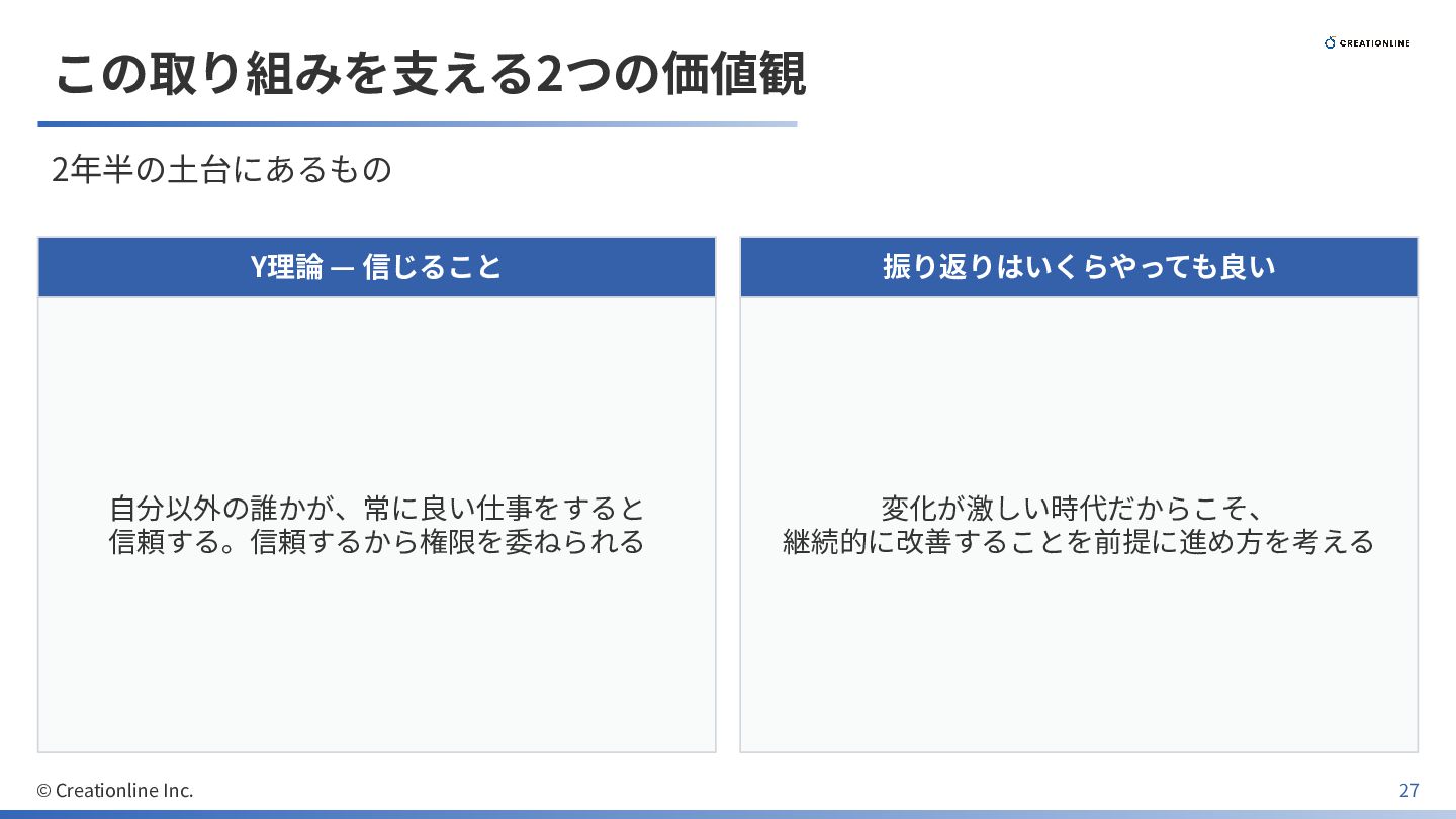この取り組みを⽀える2つの価値観 2年半の⼟台にあるもの Y理論 — 信じること ⾃分以外の誰かが、常に良い仕事をすると 信頼する。信頼するから権限を委ねられる 振り返りはいくらやっても良い 変化が激しい時代だからこそ、 継続的に改善することを前提に進め⽅を考える