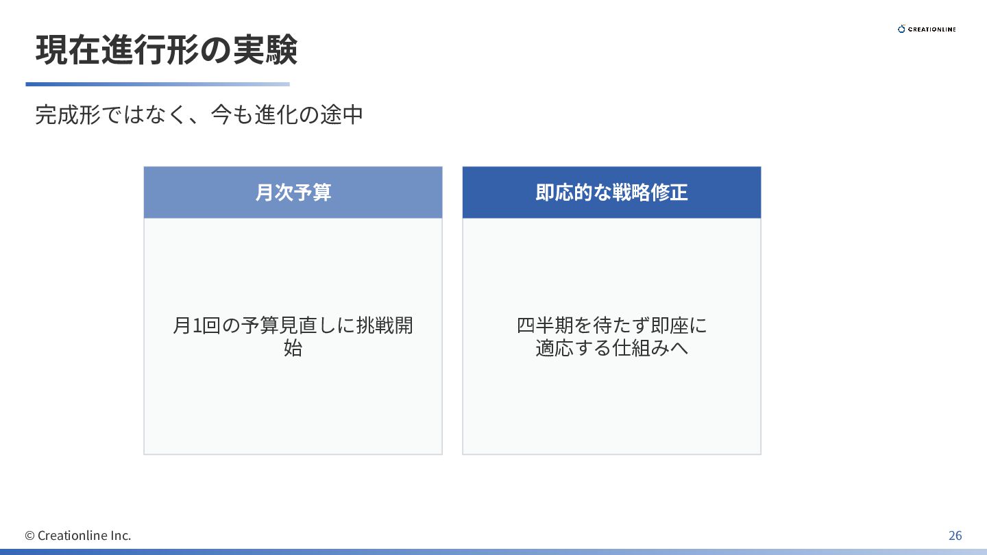 現在進⾏形の実験 完成形ではなく、今も進化の途中 ⽉次予算 ⽉1回の予算⾒直しに挑戦開 始 即応的な戦略修正 四半期を待たず即座に 適応する仕組みへ © Creationline