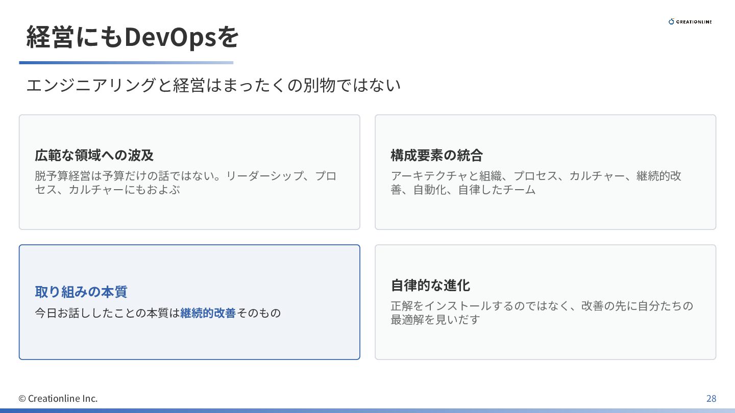 経営にもDevOpsを エンジニアリングと経営はまったくの別物ではない 広範な領域への波及 脱予算経営は予算だけの話ではない。リーダーシップ、プロ セス、カルチャーにもおよぶ 構成要素の統合 アーキテクチャと組織、プロセス、カルチャー、継続的改 善、⾃動化、⾃律したチーム 取り組みの本質 今⽇お話ししたことの本質は継続的改善そのもの