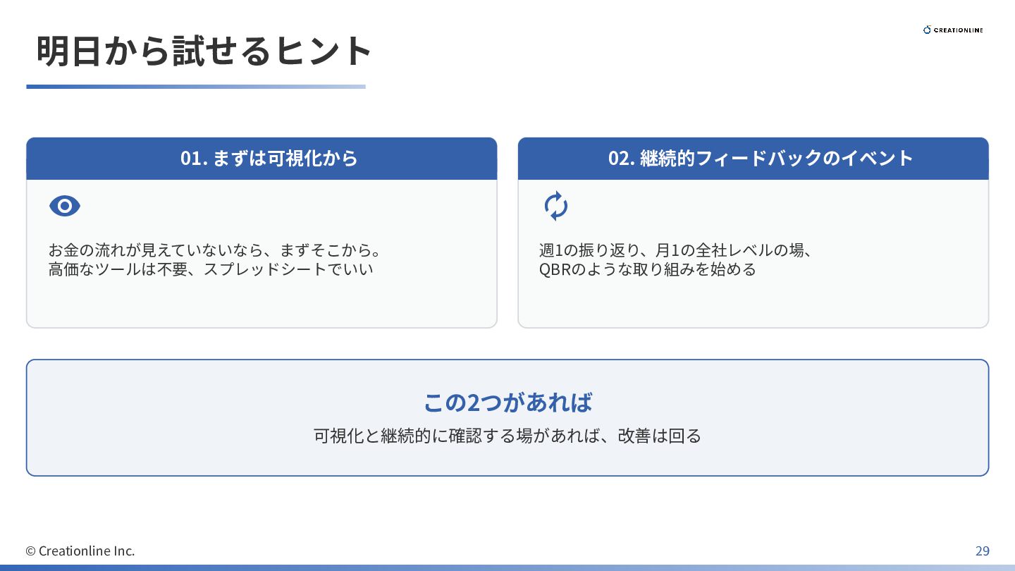 明⽇から試せるヒント 01. まずは可視化から お⾦の流れが⾒えていないなら、まずそこから。 ⾼価なツールは不要、スプレッドシートでいい 02. 継続的フィードバックのイベント 週1の振り返り、⽉1の全社レベルの場、
