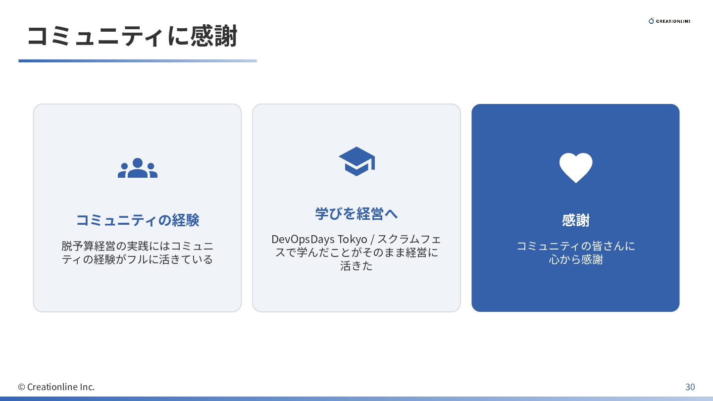 スクラムフェ スで学んだことがそのまま経営に 活きた 感謝 コミュニティの皆さんに ⼼から感謝 © Creationline Inc. 30