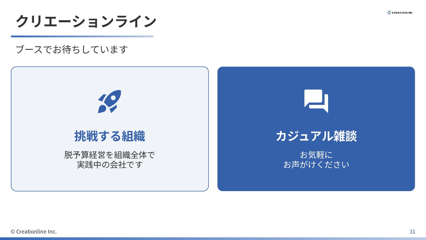 クリエーションライン ブースでお待ちしています © Creationline Inc. 31 挑戦する組織 脱予算経営を組織全体で 実践中の会社です