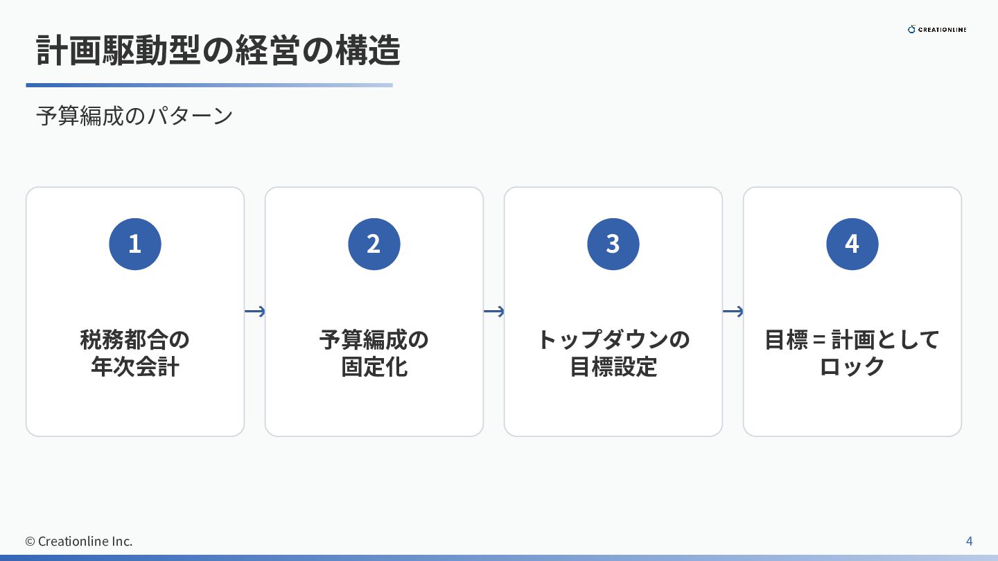 計画駆動型の経営の構造 予算編成のパターン 1 税務都合の 年次会計 2 予算編成の 固定化 3 トップダウンの