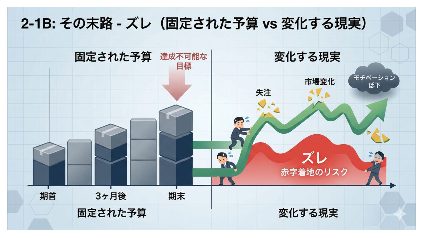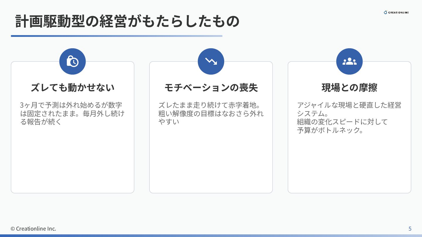 計画駆動型の経営がもたらしたもの ズレても動かせない 3ヶ⽉で予測は外れ始めるが数字 は固定されたまま。毎⽉外し続け る報告が続く モチベーションの喪失 ズレたまま⾛り続けて⾚字着地。