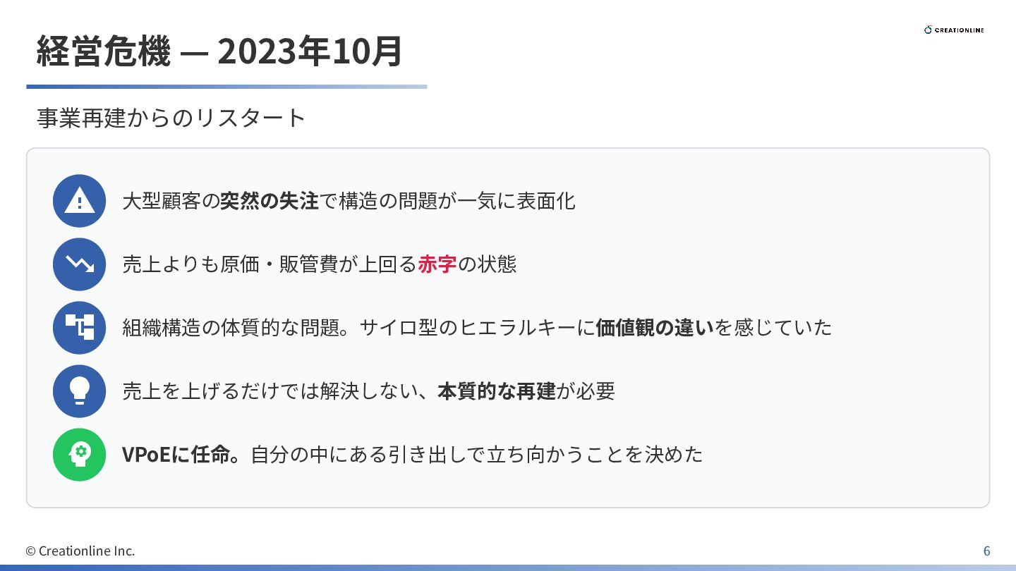 売上を上げるだけでは解決しない、本質的な再建が必要 VPoEに任命。⾃分の中にある引き出しで⽴ち向かうことを決めた © Creationline Inc. 6