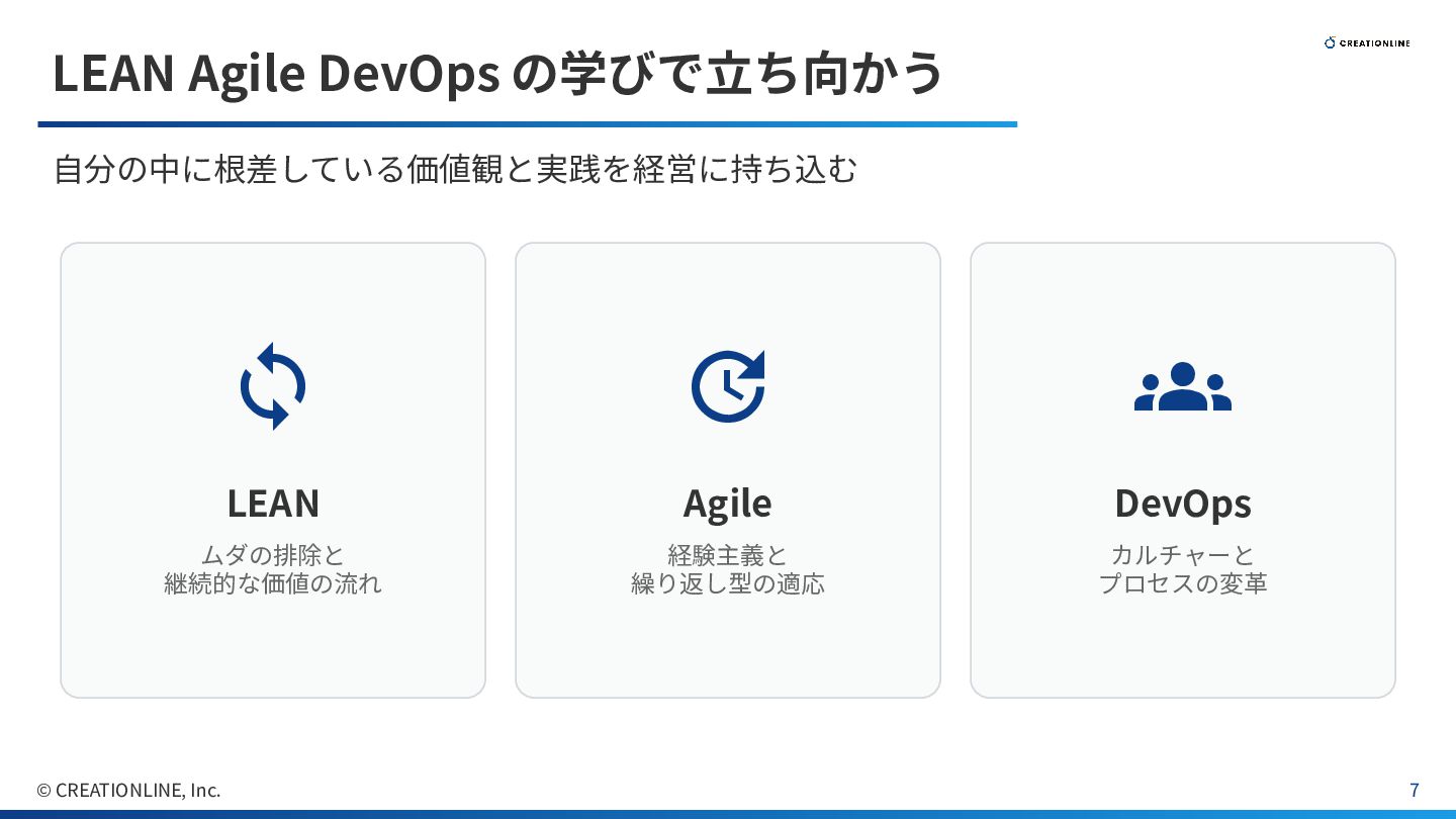 Agile 経験主義と 繰り返し型の適応 DevOps カルチャーと プロセスの変⾰ © CREATIONLINE, Inc. 7