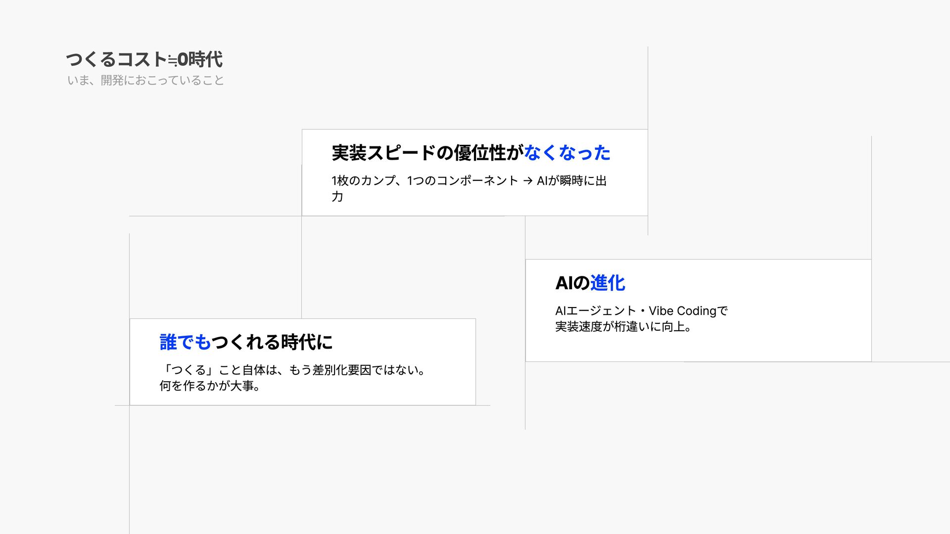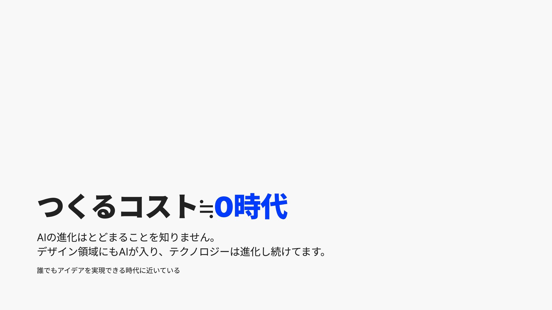 つくるコスト≒0時代 AIの進化はとどまることを知りません。 デザイン領域にもAIが入り、テクノロジーは進化し続け、誰でもアイデアを実現できる時代に近いています。