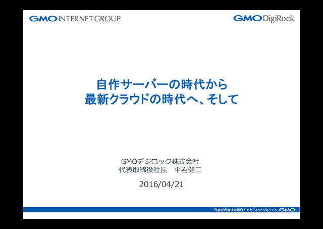 2016/04/21 GMOデジロック株式会社 代表取締役社⻑ 平岩健⼆ 自作サーバーの時代から 最新クラウドの時代へ、そして
