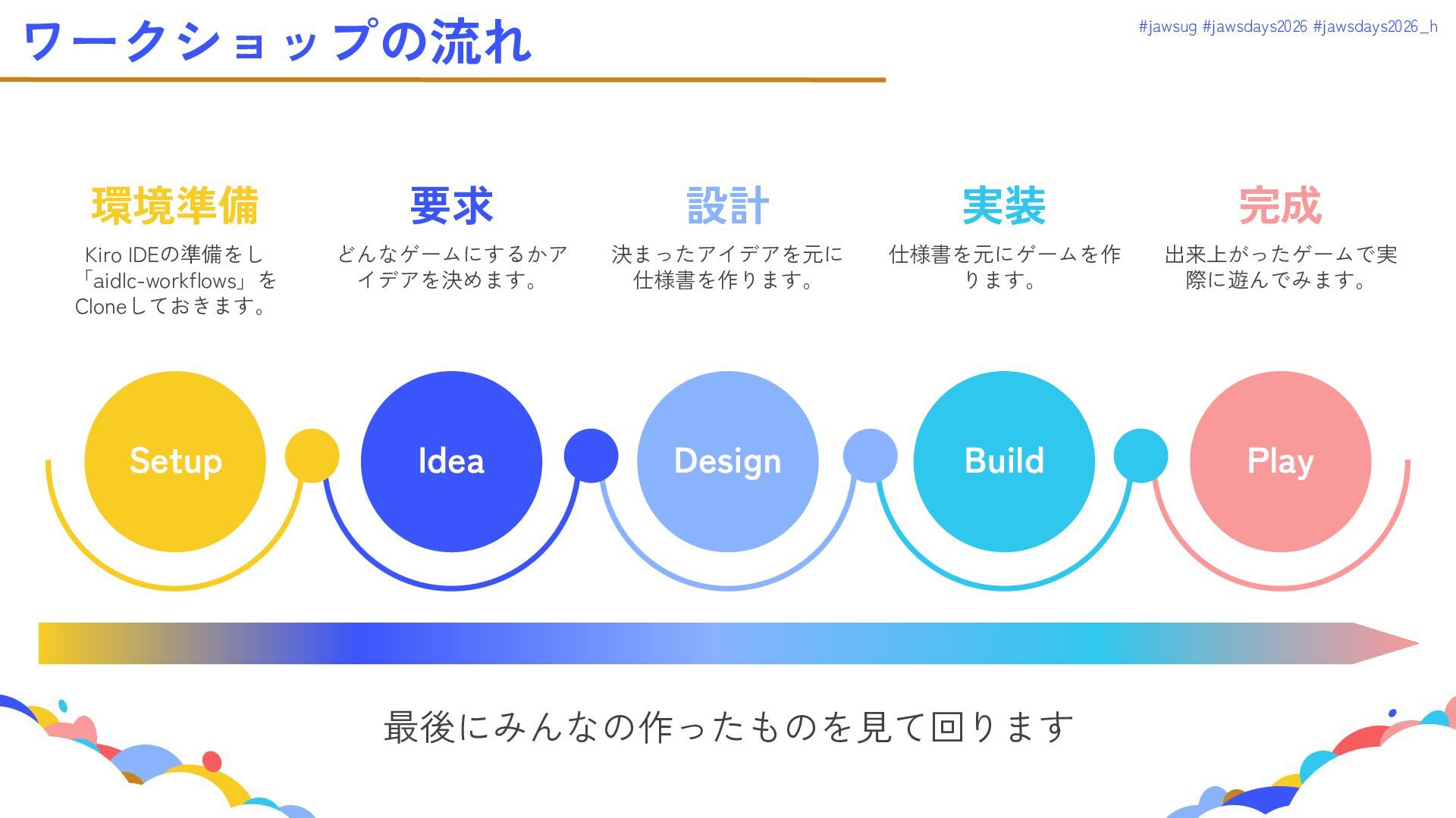 際に遊んでみます。 Setup Idea Design Build Play 環境準備 要求 設計 完成 Kiro IDEの準備をし 「aidlc-workflows」を Cloneしておきます。 どんなゲームにするかア イデアを決めます。 最後にみんなの作ったものを見て回ります