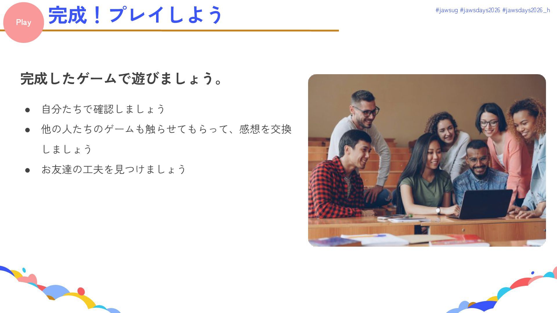 #jawsug #jawsdays2026 #jawsdays2026_h 完成!プレイしよう Play 完成したゲームで遊びましょう。 • 自分たちで確認しましょう • 他の人たちのゲームも触らせてもらって、感想を交換