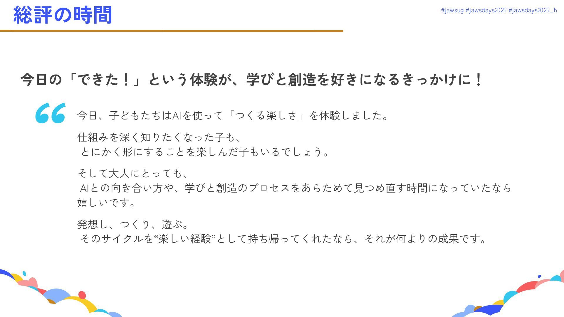 #jawsug #jawsdays2026 #jawsdays2026_h 総評の時間 “ 今日の「できた!」という体験が、学びと創造を好きになるきっかけに! 今日、子どもたちはAIを使って「つくる楽しさ」を体験しました。 仕組みを深く知りたくなった子も、 とにかく形にすることを楽しんだ子もいるでしょう。 そして大人にとっても、