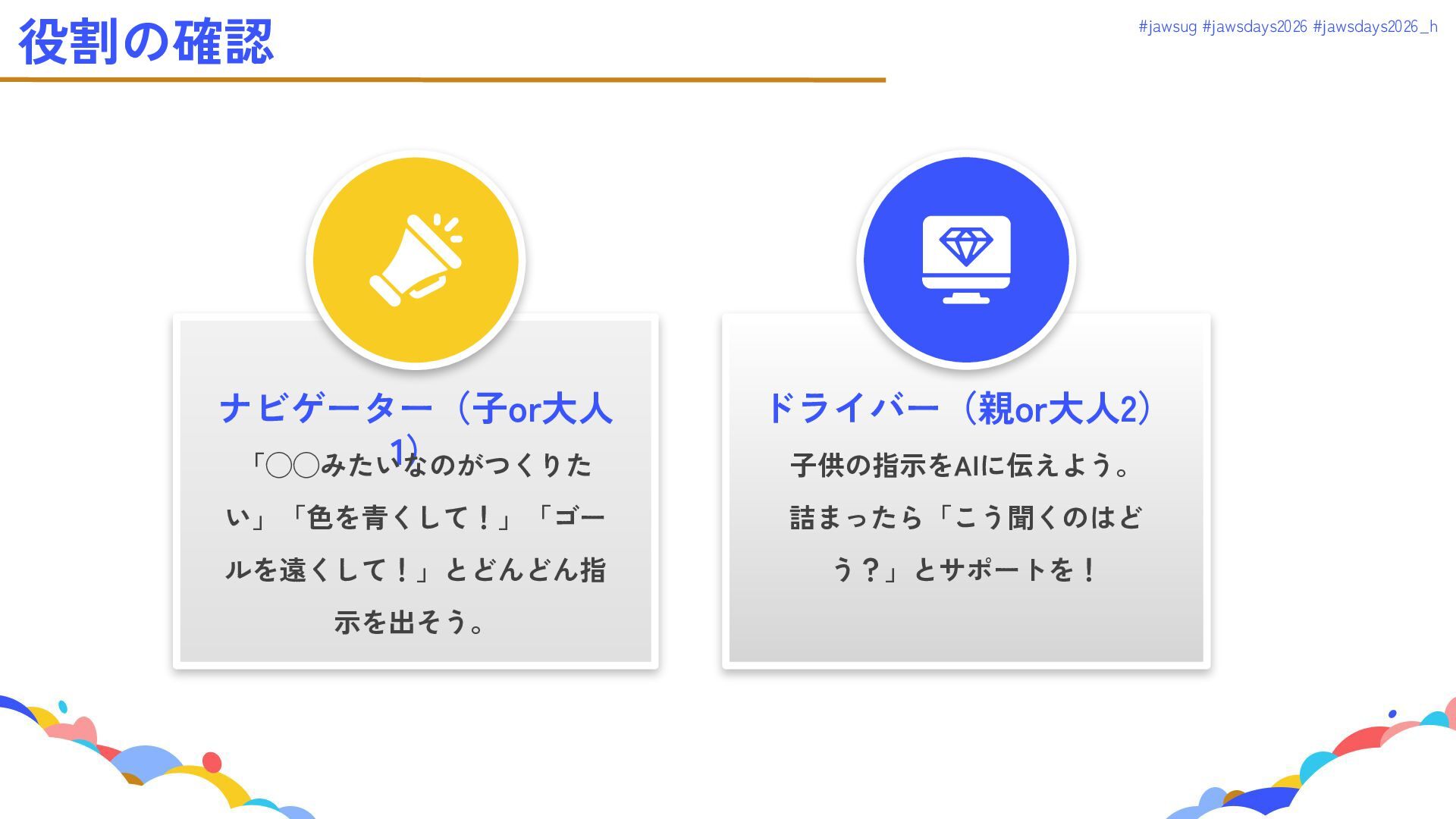 #jawsug #jawsdays2026 #jawsdays2026_h 役割の確認 ナビゲーター(子or大人 1) 「◯◯みたいなのがつくりた い」「色を青くして!」「ゴー ルを遠くして!」とどんどん指 示を出そう。