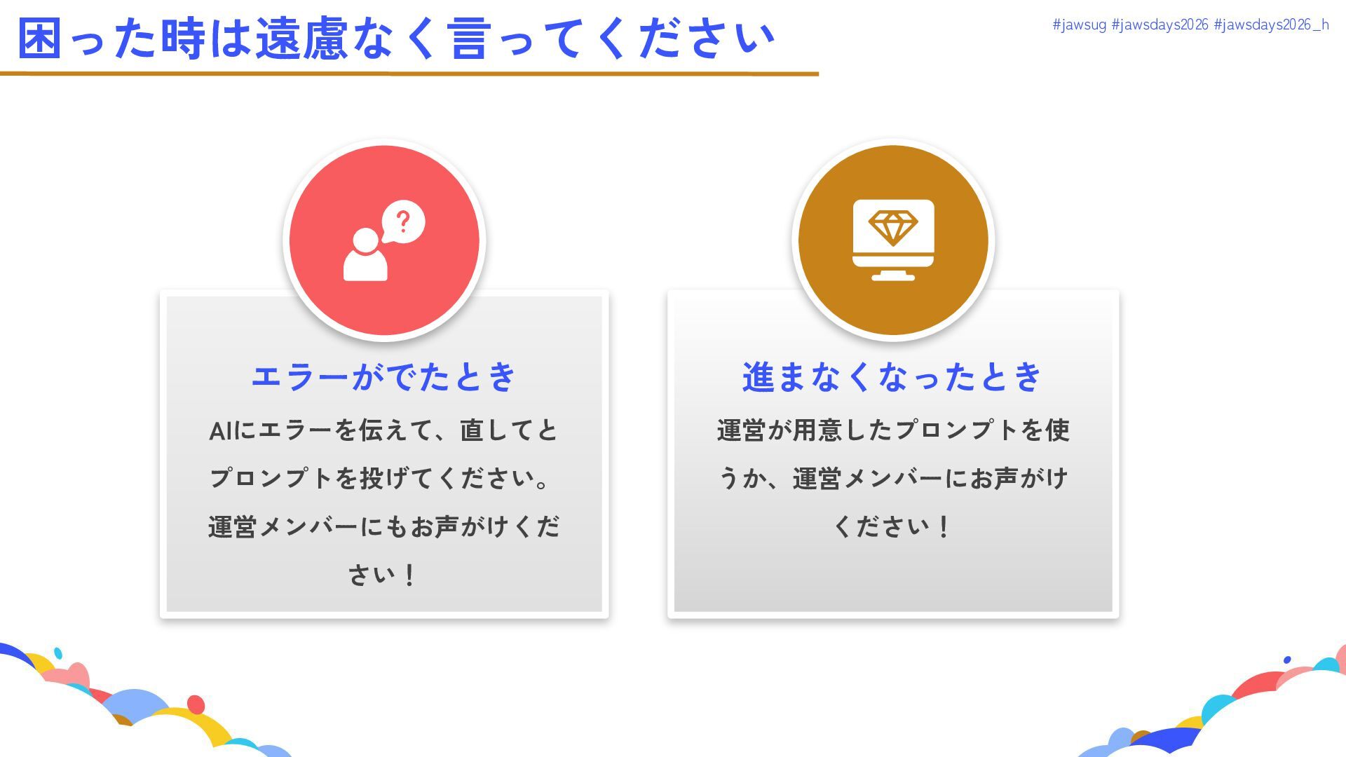 #jawsug #jawsdays2026 #jawsdays2026_h 困った時は遠慮なく言ってください エラーがでたとき AIにエラーを伝えて、直してと プロンプトを投げてください。 運営メンバーにもお声がけくだ さい! 進まなくなったとき