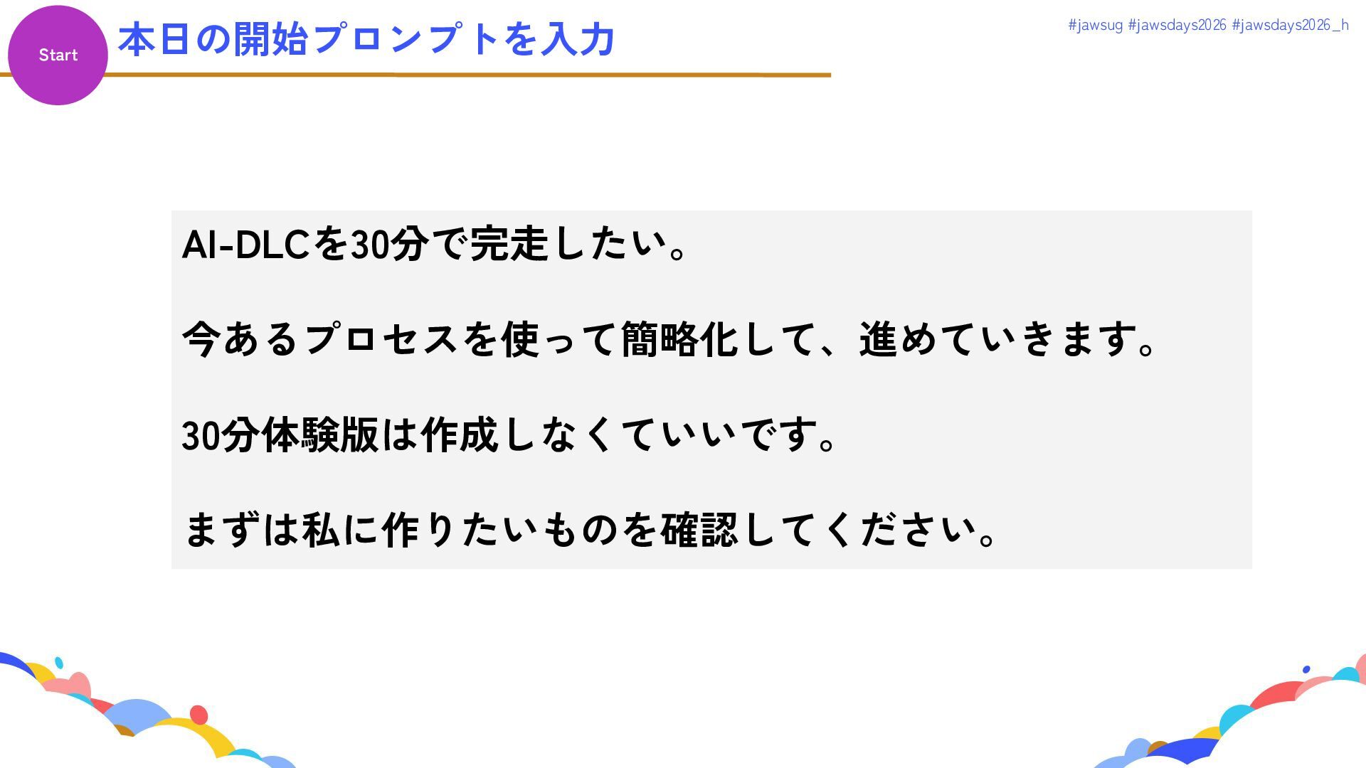 #jawsug #jawsdays2026 #jawsdays2026_h 本日の開始プロンプトを入力 Start AI-DLCを30分で完走したい。 今あるプロセスを使って簡略化して、進めていきます。 30分体験版は作成しなくていいです。 まずは私に作りたいものを確認してください。