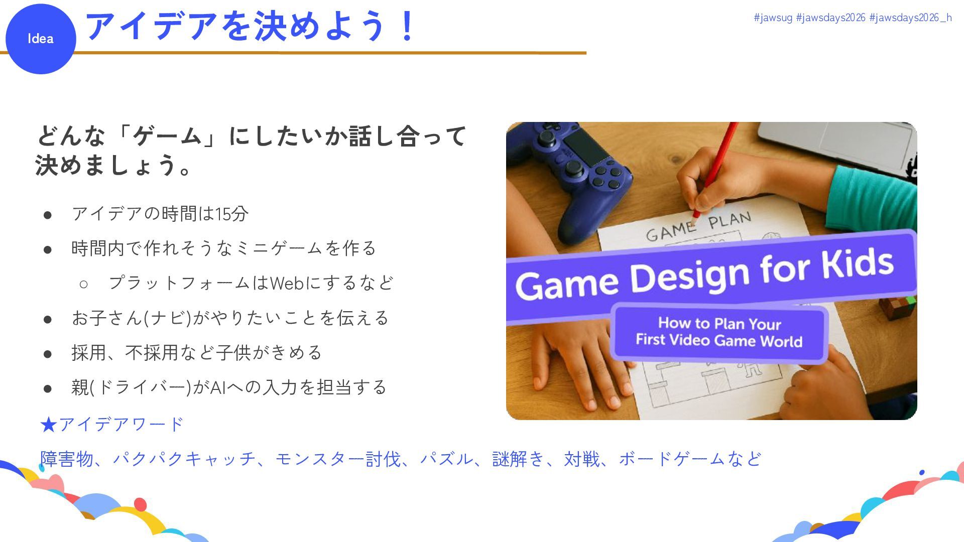 #jawsug #jawsdays2026 #jawsdays2026_h アイデアを決めよう! Idea どんな「ゲーム」にしたいか話し合って 決めましょう。 • アイデアの時間は15分 •