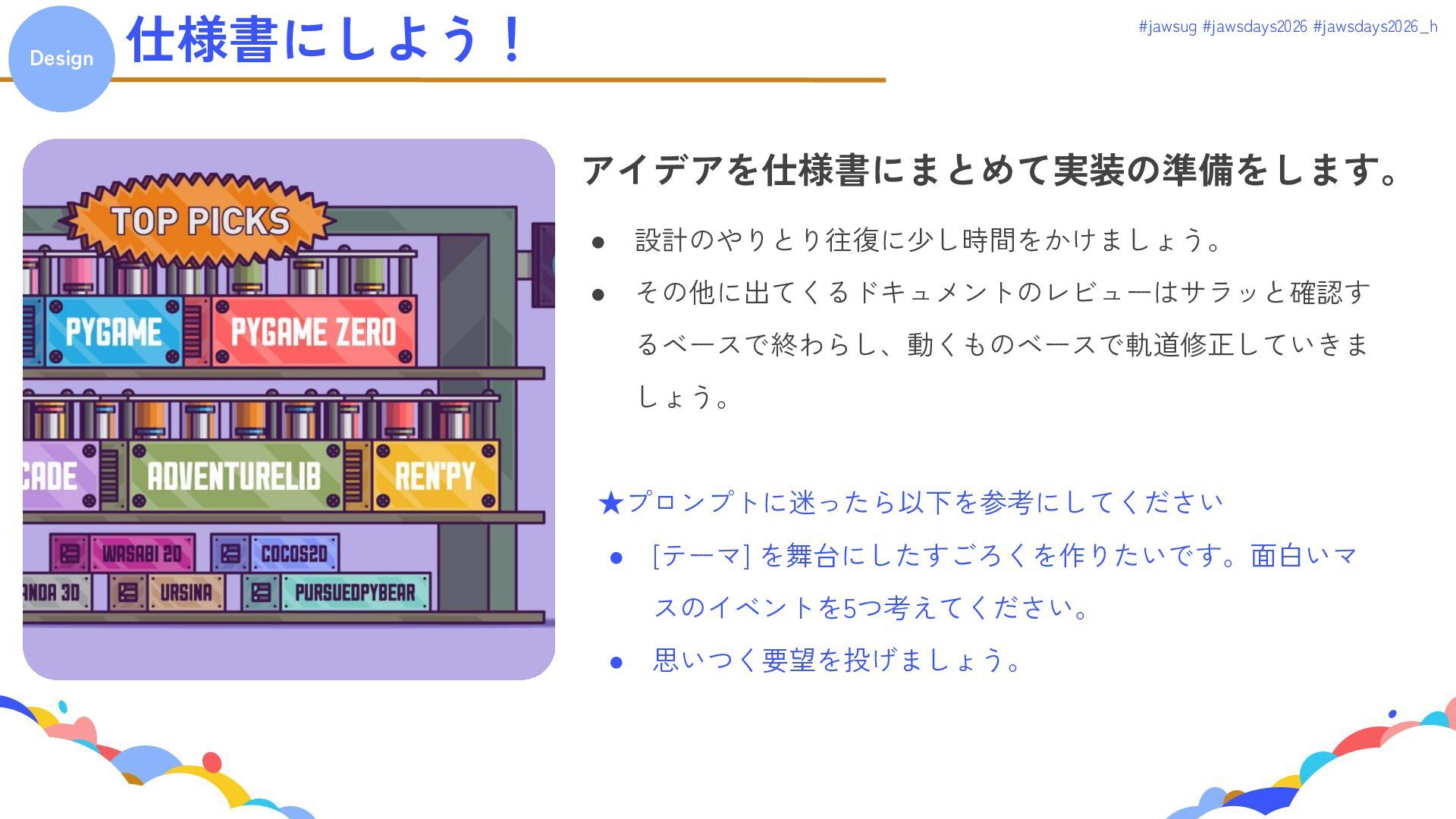 #jawsug #jawsdays2026 #jawsdays2026_h 仕様書にしよう! Design アイデアを仕様書にまとめて実装の準備をします。 • 設計のやりとり往復に少し時間をかけましょう。 • その他に出てくるドキュメントのレビューはサラッと確認す
