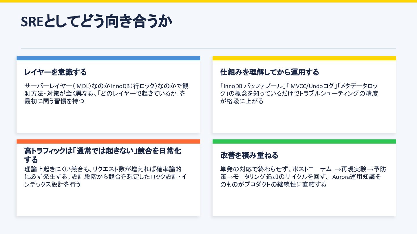 [email protected]','Bob') ← クエリB *** (2) HOLDS THE LOCK(S): index idx_email of table 'app'.'users' trx id 422 lock_mode X locks gap before rec ← B も同じギャップロックを保持 *** (2) WAITING FOR THIS LOCK TO BE GRANTED: index idx_email of table 'app'.'users' trx id 422 lock_mode X locks gap before rec insert intention waiting ← A のギャップロックに阻まれている *** WE ROLL BACK TRANSACTION (2) ← ⑤ TX(2)=クエリBがロールバック対象 読み方まとめ : ① どのクエリか → ② 何を持っているか → ③ 何を待っているか → ④ 相手も同じ構造か(=相互待機) → ⑤ どちらが ロールバックされたか