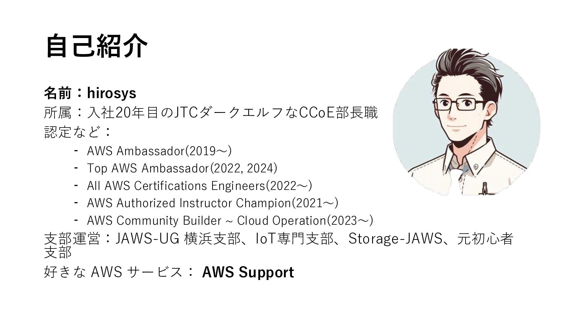 自己紹介 名前:hirosys 所属:入社20年目のJTCダークエルフなCCoE部長職 認定など: ﹣AWS Ambassador(2019〜) ﹣Top AWS Ambassador(2022, 2024)