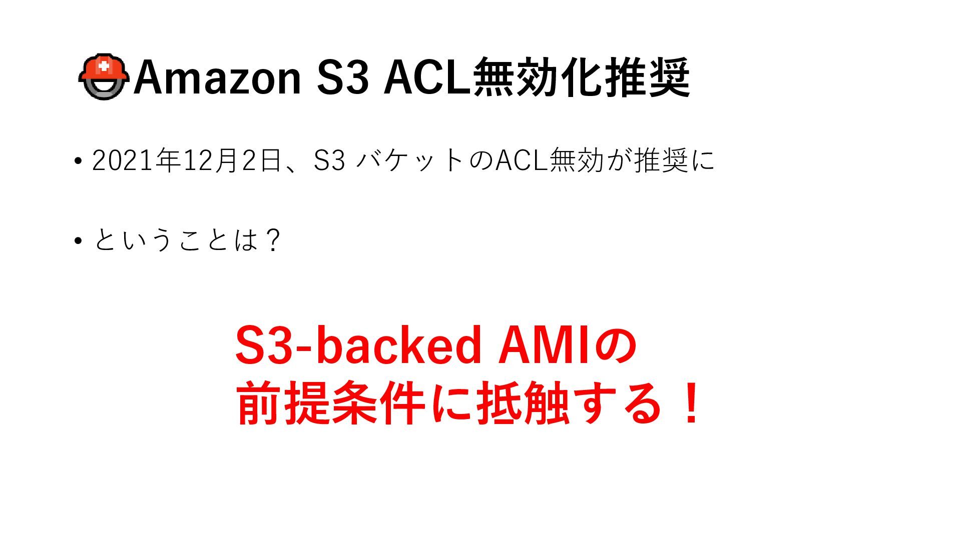 Amazon S3 ACL無効化推奨 • 2021年12月2日、S3 バケットのACL無効が推奨に • ということは? S3-backed AMIの
