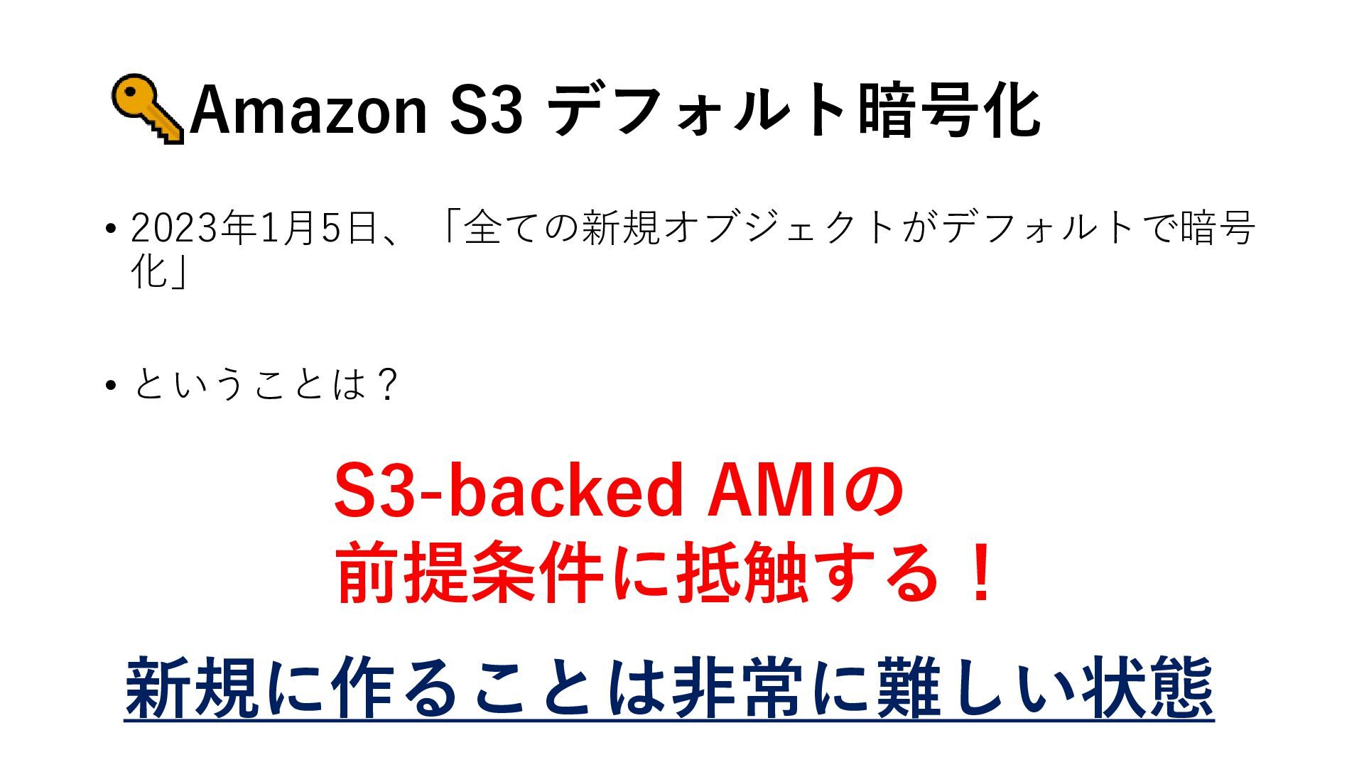 Amazon S3 デフォルト暗号化 • 2023年1月5日、「全ての新規オブジェクトがデフォルトで暗号 化」 • ということは? S3-backed AMIの