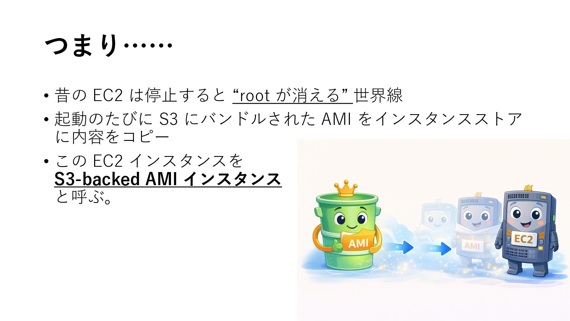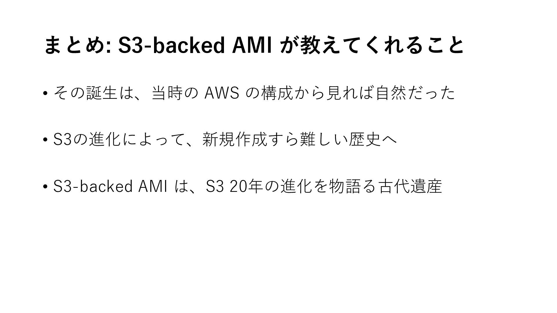 まとめ: S3-backed AMI が教えてくれること • その誕生は、当時の AWS の構成から見れば自然だった • S3の進化によって、新規作成すら難しい歴史へ