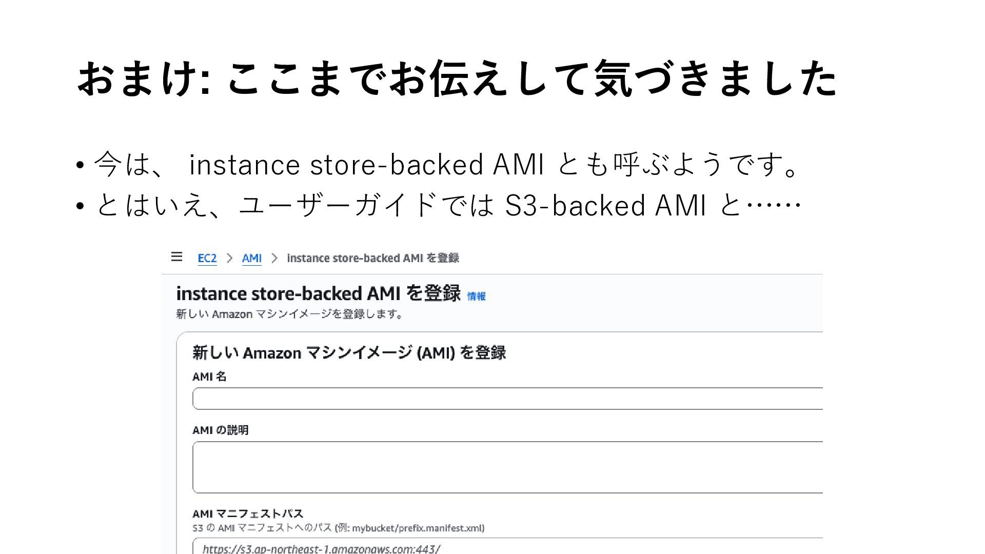 おまけ: ここまでお伝えして気づきました • 今は、 instance store-backed AMI とも呼ぶようです。 • とはいえ、ユーザーガイドでは