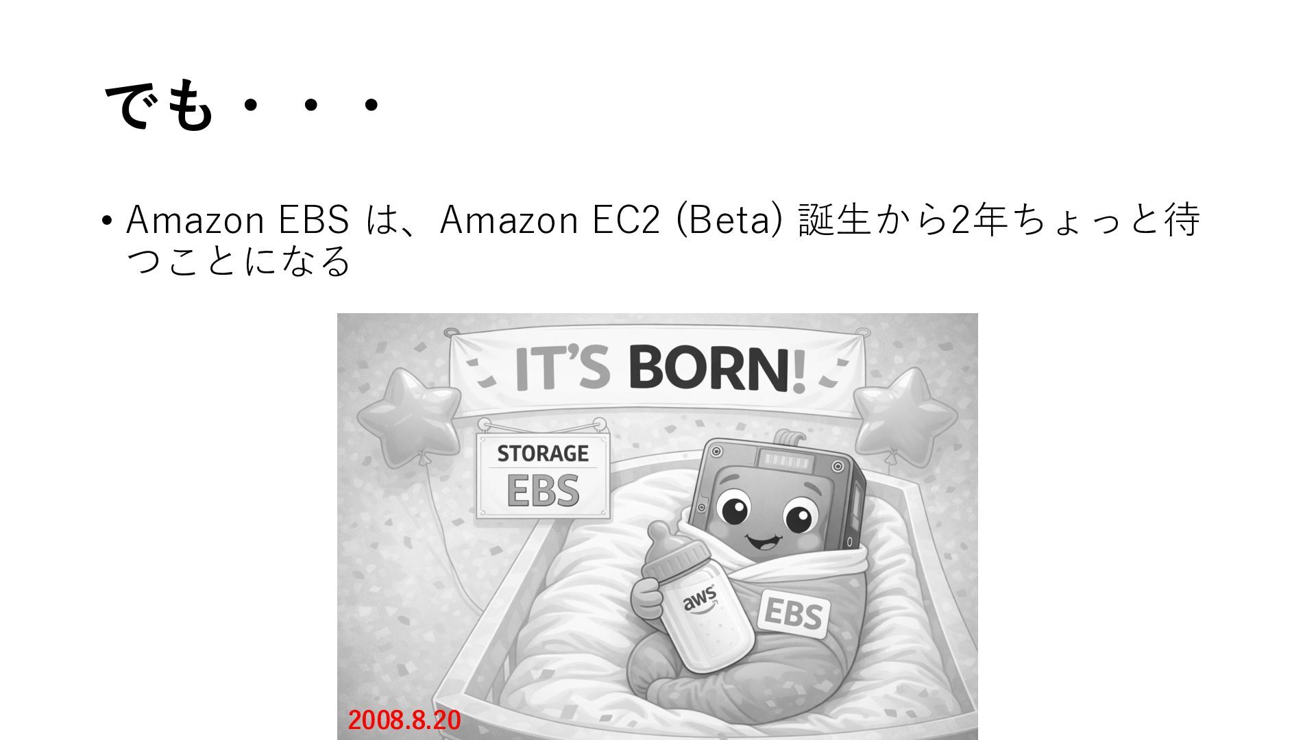 でも・・・ • Amazon EBS は、Amazon EC2 (Beta) 誕生から2年ちょっと待 つことになる 2008.8.20