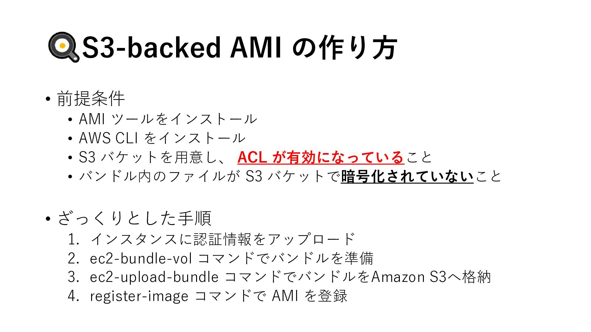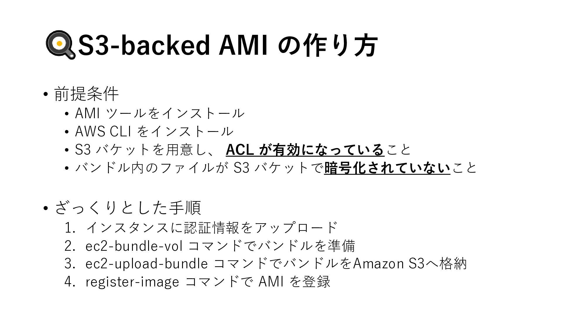 CLI をインストール • S3 バケットを用意し、 ACL が有効になっていること • バンドル内のファイルが S3 バケットで暗号化されていないこと • ざっくりとした手順 1. インスタンスに認証情報をアップロード 2. ec2-bundle-vol コマンドでバンドルを準備 3. ec2-upload-bundle コマンドでバンドルをAmazon S3へ格納 4. register-image コマンドで AMI を登録