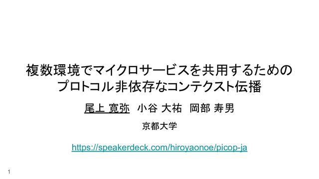 複数環境でマイクロサービスを共用するための プロトコル非依存なコンテクスト伝播 尾上 寛弥 小谷 大祐 岡部 寿男 京都大学 https://speakerdeck.com/hiroyaonoe/picop-ja 1