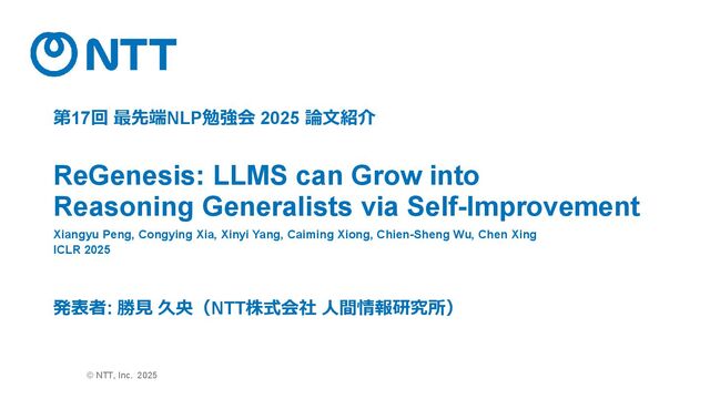 Structure Generationステップで生成した具体的な解決戦略をもと に推論パスを生成する • プロンプト › Using the following reasoning structure: {Reasoning Structure 𝑟(𝑖,𝑗) 𝑠 } Task:{Instruction 𝑞𝑖 } Solve this task step by step based on the above reasoning structure. • 出力例 › • 人手のFew-shotに依存せず、一つの問題に対して最大25通りの異なる アプローチの多様な学習データを生成できる。 Tina's regular hourly wage is $18.00 per hour. Tina works 10 hours every day, which exceeds the 8-hour limit, so she works 2 shifts (10 hours / 8 hours per shift). For each day, Tina works 8 regular hours. That's 8 * $18.00 = $144.00 per day. For each day, she works an additional 2 overtime hours. That's 2 * ($18.00 + $9.00) = $54.00 per day…