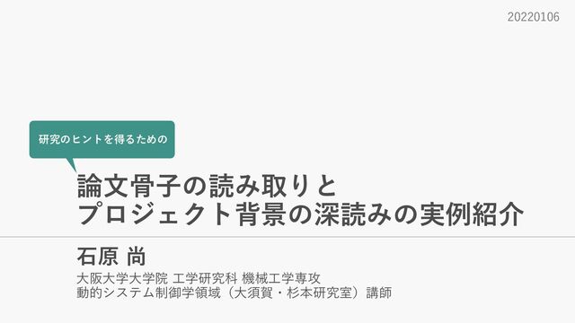1つの論文から,「その論文が出るまでのプロジェクト背景」を深読みする方法の解説です.(1)骨子(アウトライン)を要約的に読み取って,(2)深読みの窓をこじ開け,(3)書かれていない背景を深読みする,という手順を具体的に説明しています.大阪大学大学院 工学研究科 機械工学専攻の修士前期課程の講義で使用した資料を一部改変したものです.
