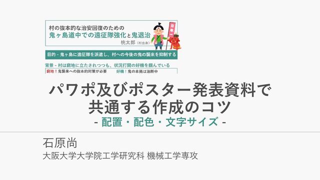 あることがわかる 情報のまとまりが 枠と隙間で明確 どこに何が書かれ ているかも明確 目的 - この例では, 基本色は緑, 差し色は赤 要点は基本色に. 枠線の色も合わ せるとすっきり. 図表の配色も合わ せるとすっきり. 枠や隙間,図形で情報の構造を伝える.こ れがだめだと何を記入しても分かりにくい. 基本色と差し色の二色を基本とするとうる さくならず,見やすい. 新聞のように,情報階層上位ほど大きくす る.詳細を見る前に概略を把握するのが楽. 題目が最大. 題目中でもサイ ズに差がついて いるのに注目. 第1階層(16pt) 第2階層(14pt) 第3階層(10pt) 第1階層の文字 を読むだけで概 略が掴める ※上記の例では太字フォントは游ゴシック,通常フォントは游ゴシックMediumを使用. ※上記の例のRGB設定は,緑(62,146,136),赤(192,57,54),黒(77,77,77) 同じ階層の情報 は同じサイズに