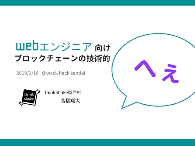 XFCエンジニア 向け ブロックチェーンの技術的 へぇ 髙橋翔太 thinkShake製作所 2019/1/16 @wack hack sendai