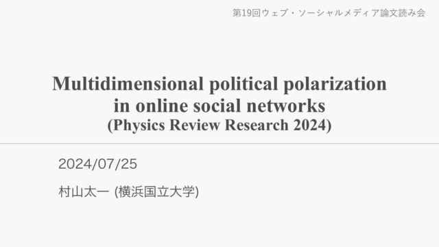Review Research, 2024) Antonio F. Peralta, Pedro Ramaciotti, J ́anos Kert ́esz, and Gerardo I ̃niguez1 (Central European University) l Physics Review Research: 2019年から始まった物理系ジャーナル l ஶऀAntonio F. Peralta, Gerardo I ̃niguez1 l ΦʔετϦΞͷCentral European Universityʹॴଐ l Opinion DynamicsݚڀΛத৺ʹߦ͍ͬͯΔ l ࠷ۙͷOpinion DynamicsͷSurveyจ”Opinion dynamics in social networks: From models to data”ͳͲΛࣥච l ͲΜͳจʁ ιʔγϟϧϝσΟΞσʔλ͔Βղऍੑͷߴ͍࣏తۃੑͷදݱͷऔಘΛࢦͯ͠ɺࠃձٞһͱ൴ΒΛϑΥϩʔ͢Δ ϢʔβͷωοτϫʔΫσʔλɺͦͯ͠ɺౘͷཱΛهड़࣏ͨ͠ௐࠪσʔλΛΈ߹Θͤͯɺ֤ϢʔβΛ࣏త ΦϐχΦϯۭؒʢղऍੑͷߴ͍ຒΊࠐΈۭؒʣʹஔ͢Δख๏ΛఏҊɻߏஙۭ͔ͨؒ͠ΒɺࠃձٞһͱϢʔβͷ ͷҧ͍Λੳɻͦͯ͠ɺ࣏తΦϐχΦϯۭؒΛ༻͍ͨ0QJOJPO%ZOBNJDTϞσϧΛద༻͢Δ͜ͱͰɺσʔλ ʹݟΒΕΔ࣏తภΛઆ໌Ͱ͖ΔϝΧχζϜΛൃݟɻ