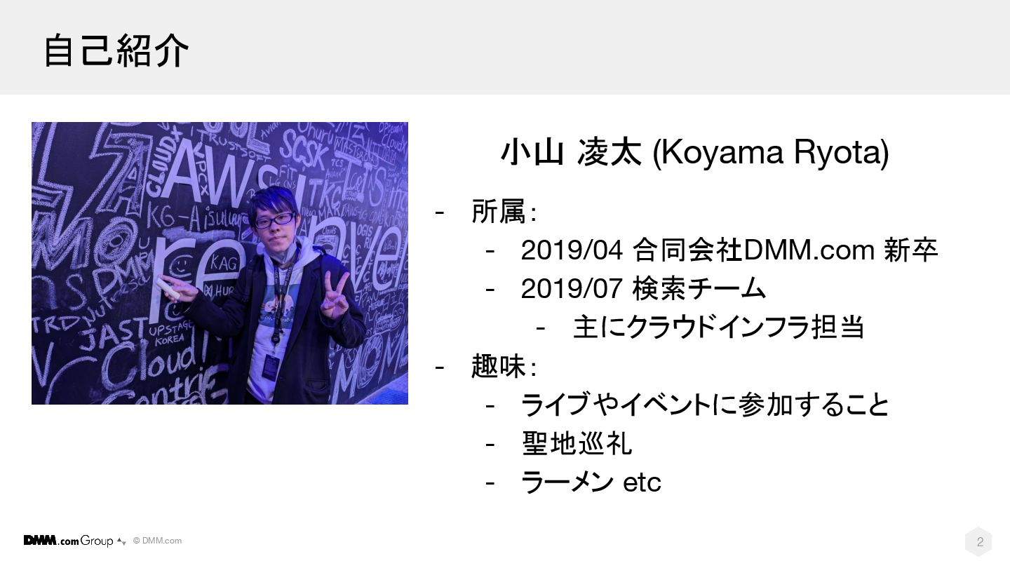- 2019/07 検索チーム - 主にクラウドインフラ担当 - 趣味: - ライブやイベントに参加すること - 聖地巡礼 - ラーメン etc 小山 凌太 (Koyama Ryota)