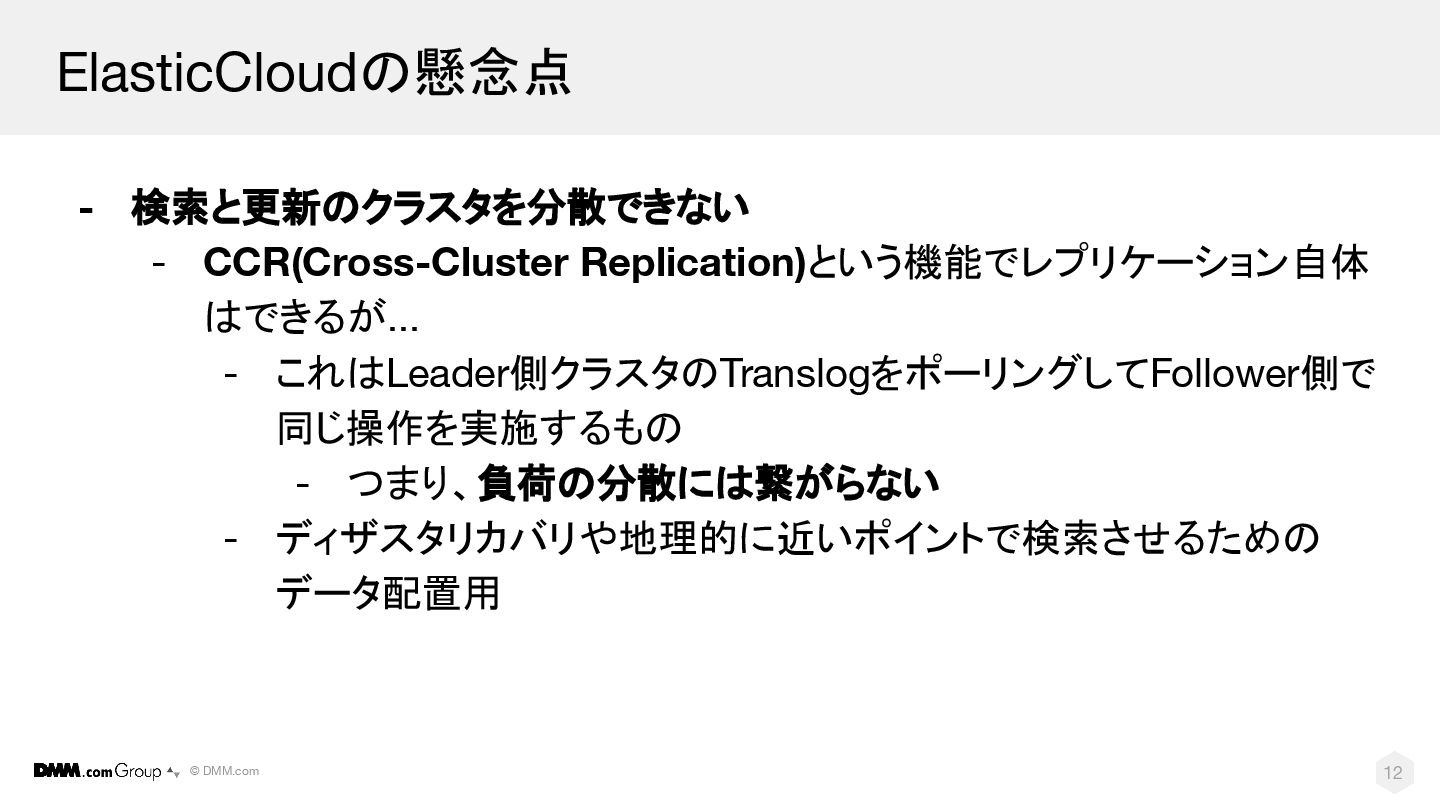 © DMM.com 12 ElasticCloudの懸念点 - 検索と更新のクラスタを分散できない - CCR(Cross-Cluster Replication)という機能でレプリケーション自体 はできるが...