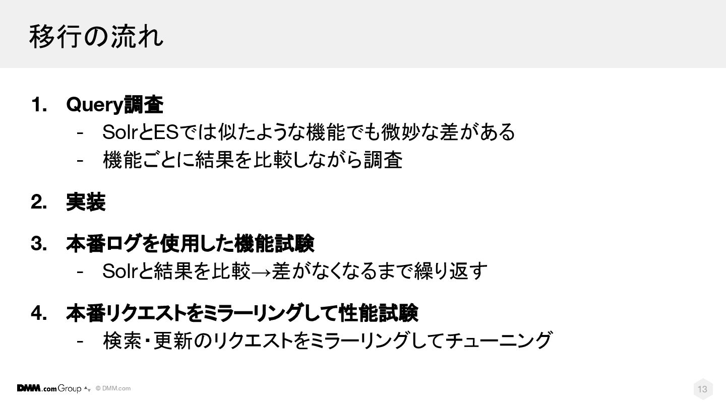 © DMM.com 13 移行の流れ 1. Query調査 - SolrとESでは似たような機能でも微妙な差がある - 機能ごとに結果を比較しながら調査
