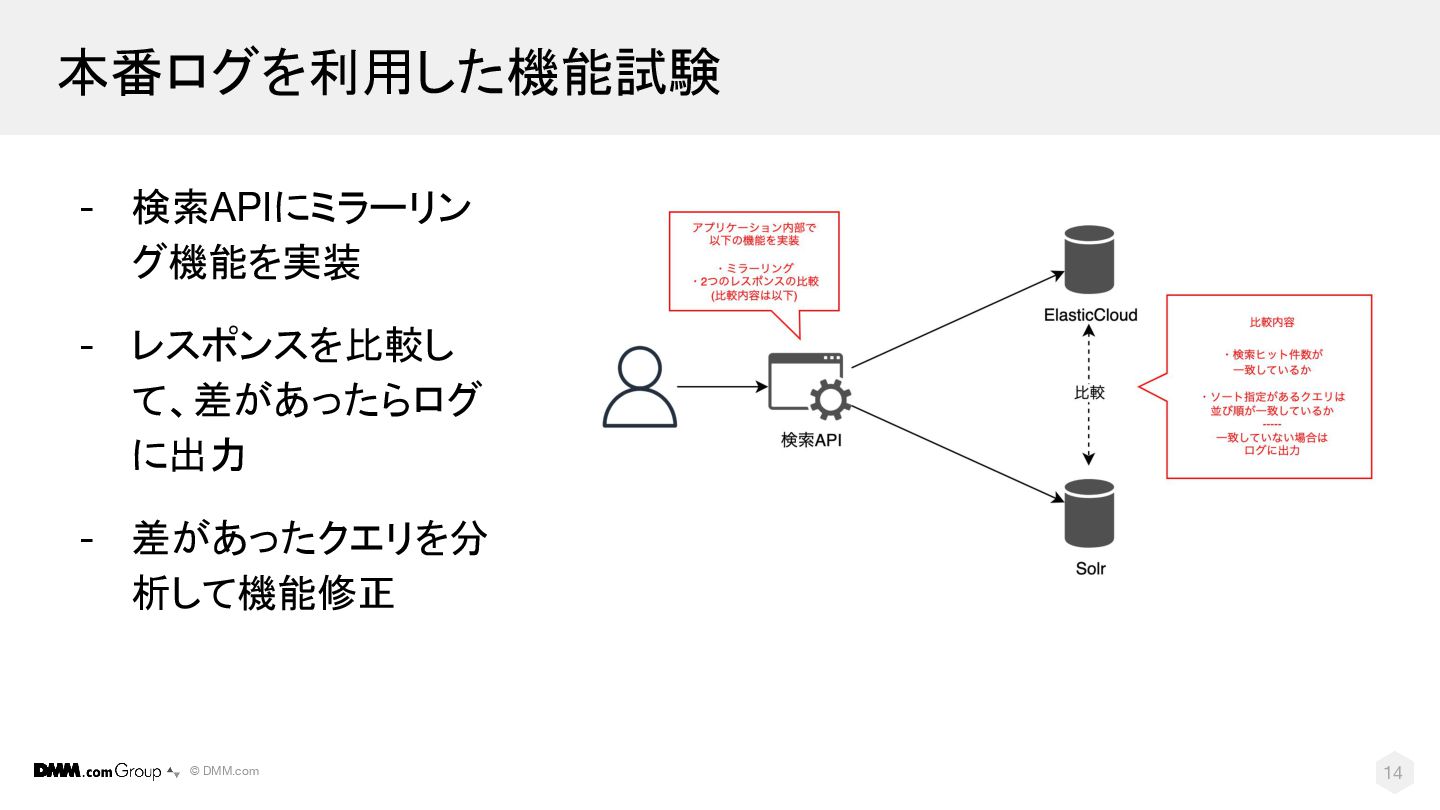 © DMM.com 14 本番ログを利用した機能試験 - 検索APIにミラーリン グ機能を実装 - レスポンスを比較し て、差があったらログ