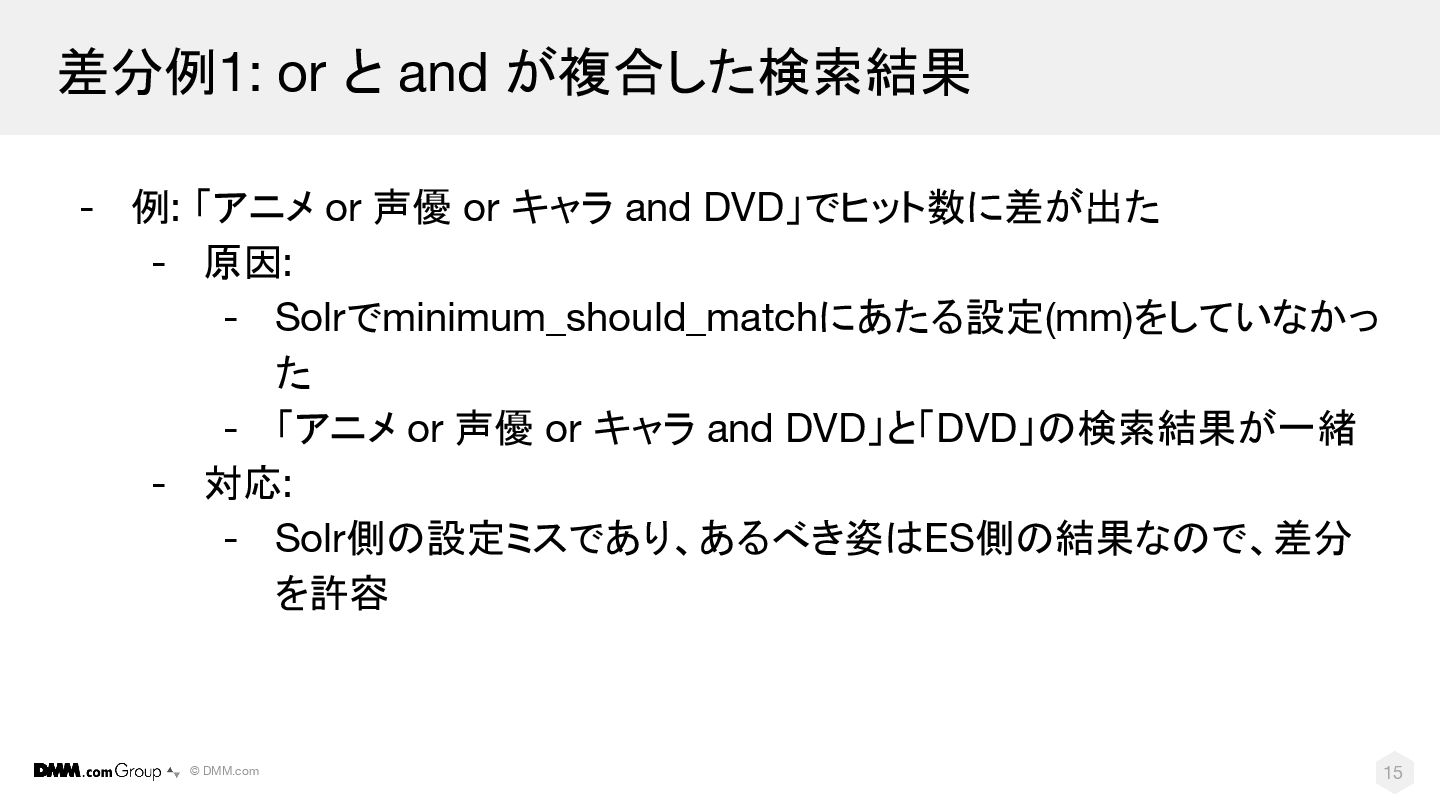 「アニメ or 声優 or キャラ and DVD」でヒット数に差が出た - 原因: - Solrでminimum_should_matchにあたる設定(mm)をしていなかっ た - 「アニメ or 声優 or キャラ and DVD」と「DVD」の検索結果が一緒 - 対応: - Solr側の設定ミスであり、あるべき姿はES側の結果なので、差分 を許容