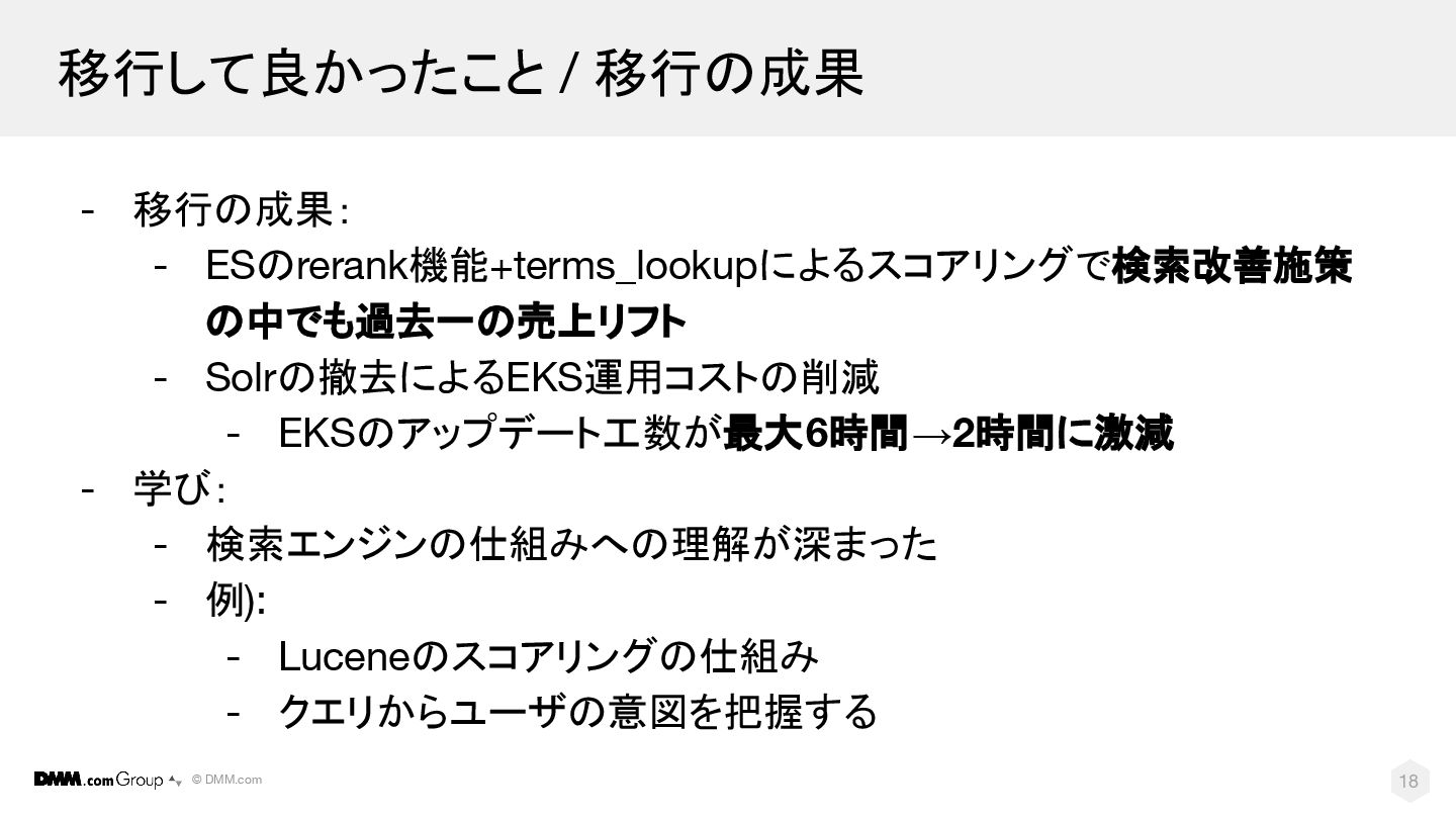 © DMM.com 18 移行して良かったこと / 移行の成果 - 移行の成果: - ESのrerank機能+terms_lookupによるスコアリングで検索改善施策