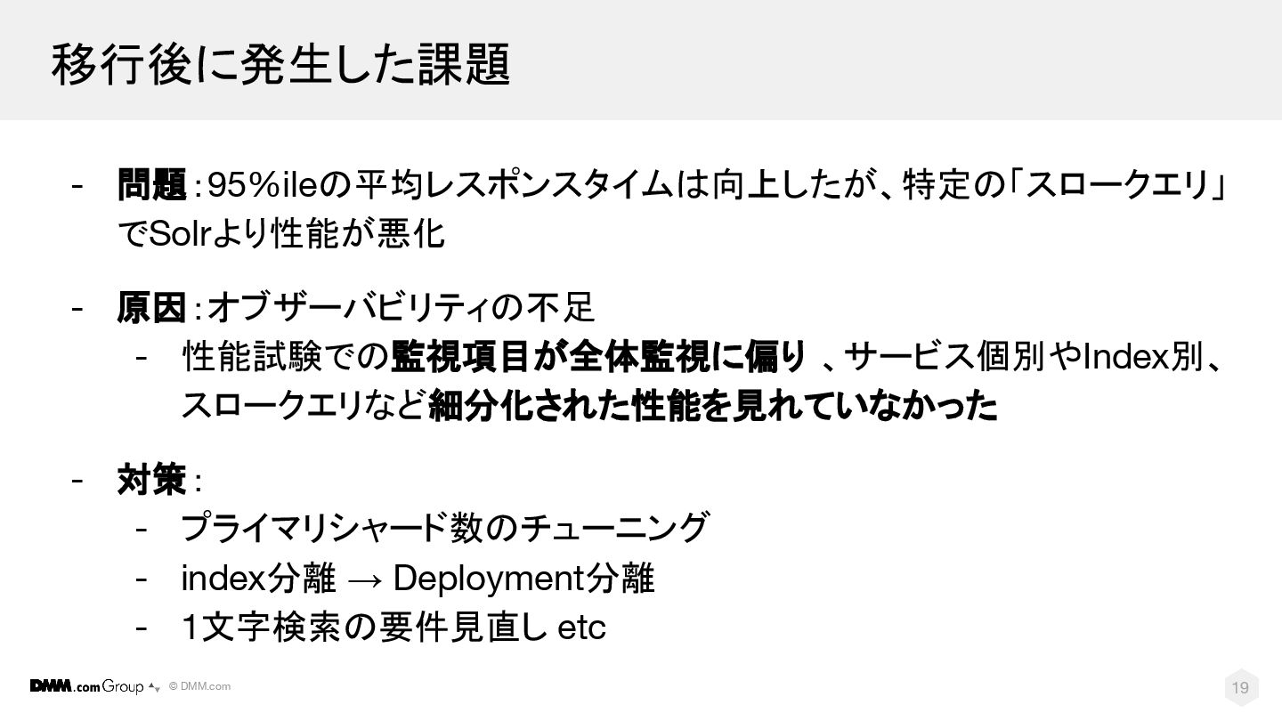 © DMM.com 19 移行後に発生した課題 - 問題:95%ileの平均レスポンスタイムは向上したが、特定の「スロークエリ」 でSolrより性能が悪化 - 原因:オブザーバビリティの不足 -